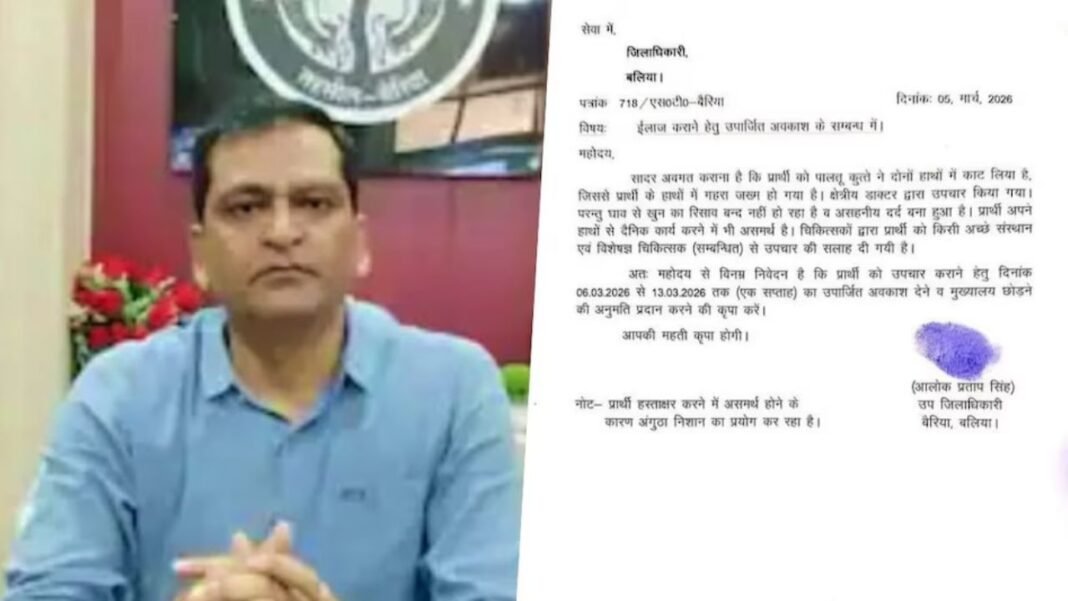 Ballia SDM Dog Attack : बलिया (उत्तर प्रदेश)। बलिया जिले की बैरिया तहसील में तैनात उप जिलाधिकारी (SDM) आलोक प्रताप सिंह को एक बेहद दुर्भाग्यपूर्ण घटना का सामना करना पड़ा है। अपने पिता को पालतू कुत्ते के हमले से बचाने की कोशिश में वे खुद गंभीर रूप से घायल हो गए हैं। घायल अधिकारी द्वारा छुट्टी के लिए दिया गया एक अनोखा प्रार्थना पत्र अब सोशल मीडिया पर तेजी से वायरल हो रहा है।