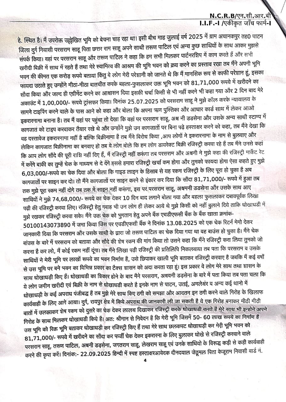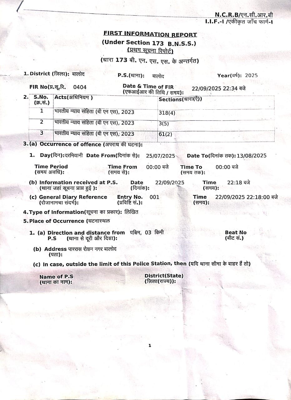 Balod News : अश्वनी डड़सेना के खिलाफ पहले से ही कई आपराधिक प्रकरण दर्ज हैं। आरोप है कि उसने फर्जी दस्तावेजों के ज़रिये ज़मीन रजिस्ट्री करवाई और भोले-भाले लोगों को ठगने का संगठित खेल लंबे समय तक चलाया।