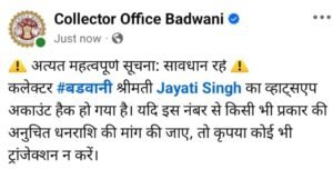 M.P News : बड़वानी कलेक्टर जयति सिंह का WhatsApp हैक, अधिकारियों को अलर्ट