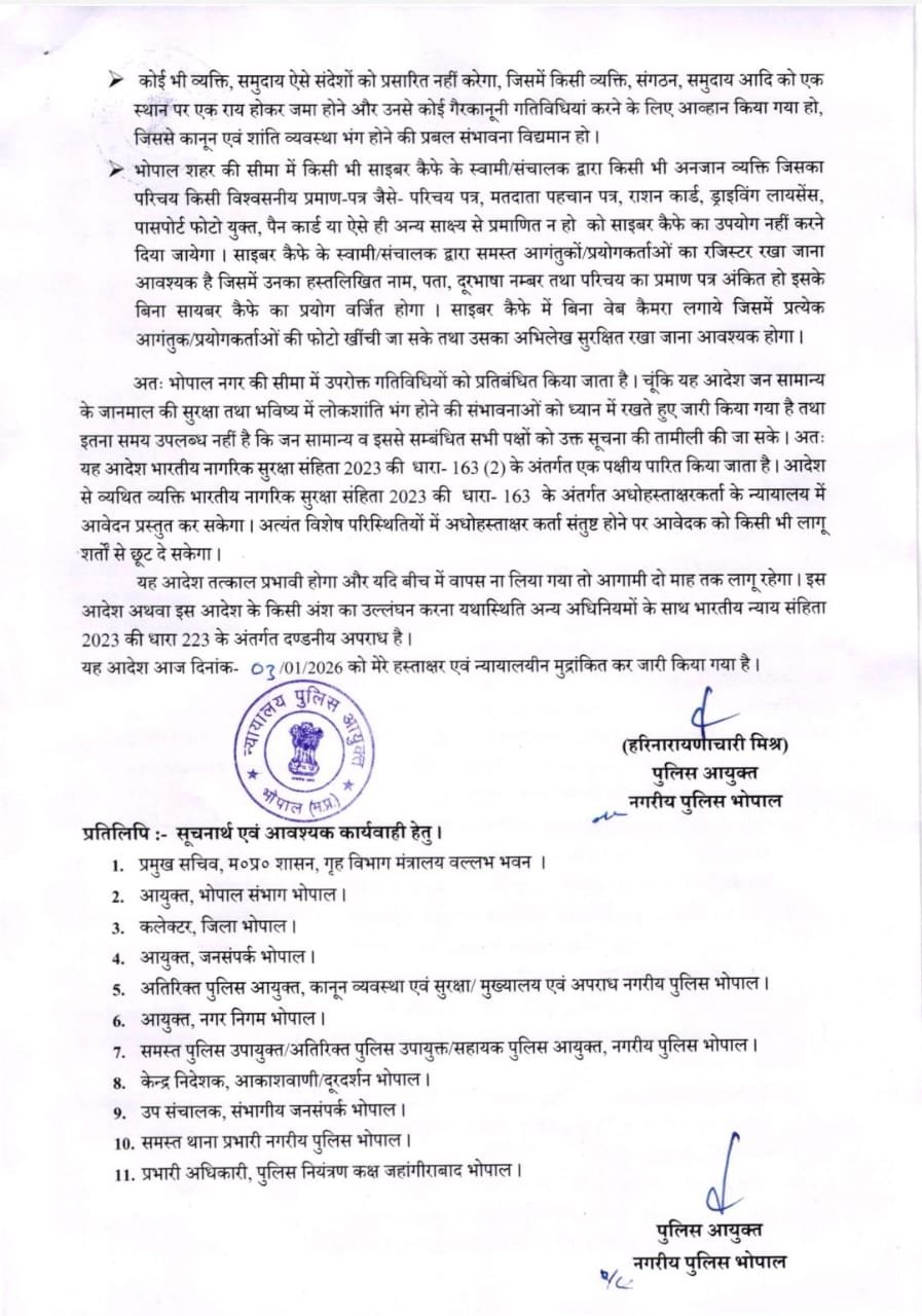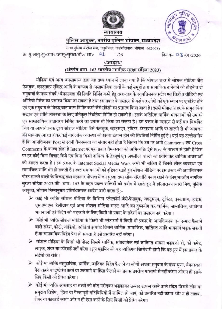 Bhopal Police Social Media Ban : भोपाल: सोशल मीडिया को अखाड़ा बनाने वालों के लिए भोपाल पुलिस कमिश्नर ने रेड अलर्ट जारी किया है। इंटरनेट पर फैलती नफरत और कमेंट बॉक्स में छिड़ने वाली जुबानी जंग को रोकने के लिए भारतीय नागरिक सुरक्षा संहिता (BNSS) 2023 की धारा 163 लागू कर दी गई है।