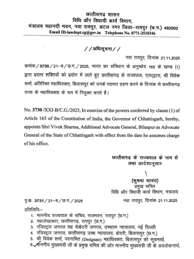Big News : छत्तीसगढ़ हाईकोर्ट में बड़ा बदलाव : विवेक शर्मा को मिली नए महाधिवक्ता की जिम्मेदारी
