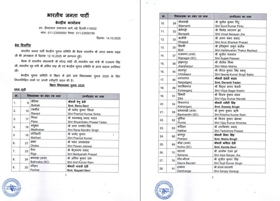 पटना। बिहार विधानसभा चुनाव 2025 के लिए भाजपा ने अपनी पहली सूची जारी कर दी है, जिसमें कुल 71 उम्मीदवार शामिल हैं। सूची में कई दिग्गज और अनुभवी नेताओं के टिकट काटे गए हैं, जिससे नई पीढ़ी को चुनावी मैदान में उतरने का अवसर मिला है और राजनीतिक गलियारों में हलचल तेज हो गई है।