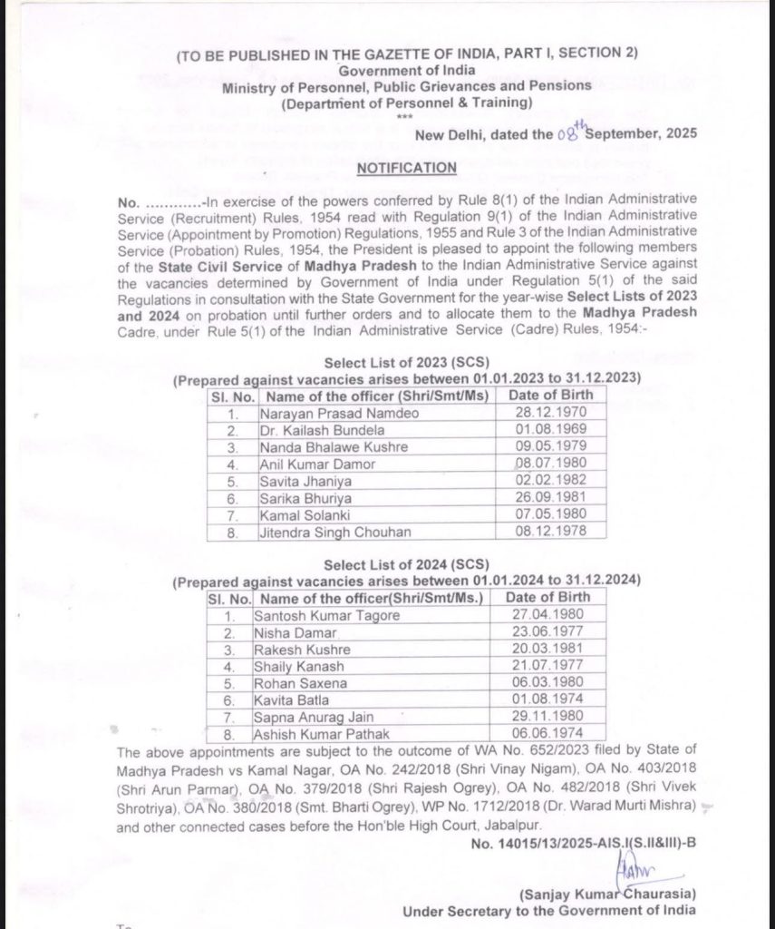 Breaking News : भोपाल: मध्य प्रदेश के राज्य प्रशासनिक सेवा (SPS) के अधिकारियों के लिए खुशखबरी है। कार्मिक, लोक शिकायत और पेंशन मंत्रालय (Ministry of Personnel, Public Grievances and Pensions) ने राज्य प्रशासनिक सेवा के 16 अधिकारियों को भारतीय प्रशासनिक सेवा (IAS) का कैडर आवंटित किया है। इस संबंध में आदेश भी जारी हो गया है।