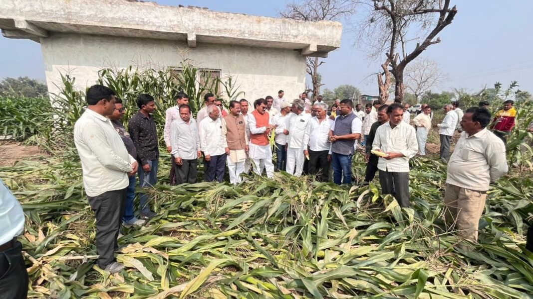 Burhanpur Crop Damage : बुरहानपुर (गोपाल देवकर)। बुरहानपुर जिले में पिछले दिनों आए भीषण आंधी-तूफान और बेमौसम बारिश ने किसानों की मेहनत पर पानी फेर दिया है। खेतों में लहलहाती गेहूं, मक्का, चना और केले की फसलें पूरी तरह जमीन पर बिछ गई हैं। किसानों के इसी दर्द को साझा करने और नुकसान का वास्तविक जायजा लेने के लिए सांसद ज्ञानेश्वर पाटील आज प्रशासनिक अमले के साथ प्रभावित क्षेत्रों के दौरे पर रहे।