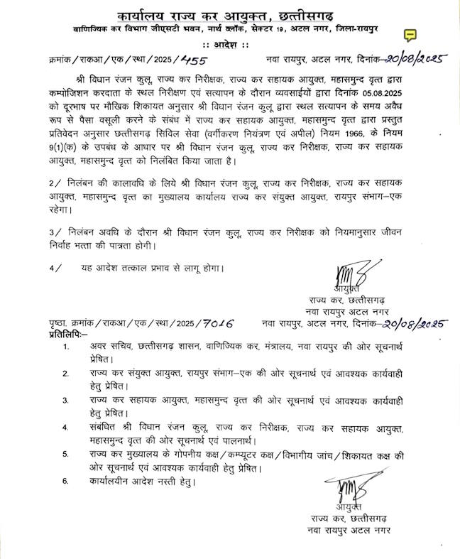 CG BREAKING : रायपुर। वाणिज्यिक कर विभाग में पदस्थ सहायक आयुक्त सह निरीक्षक विधान रंजन कुलू पर वसूली के गंभीर आरोप के बाद बड़ी कार्रवाई की गई है। राज्य कर आयुक्त ने उन्हें तत्काल प्रभाव से निलंबित कर दिया है।
