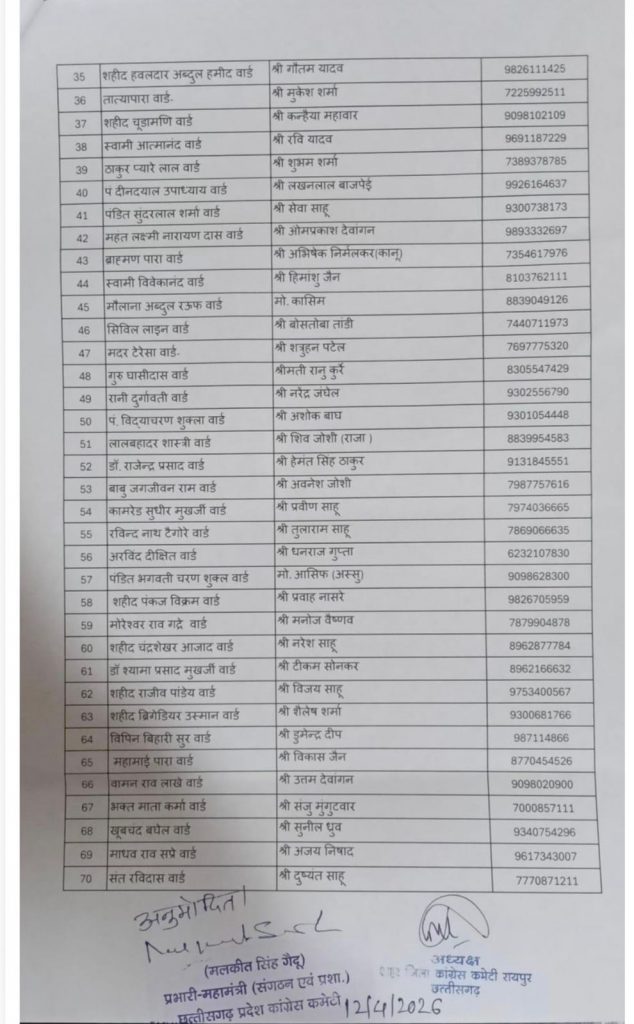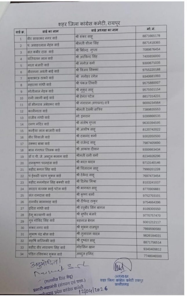 CG Congress List: विवादों के बाद दूसरी बार रायपुर कांग्रेस की लिस्ट जारी, 70 वार्डों में हुई वार्ड अध्यक्षों की नियुक्ति