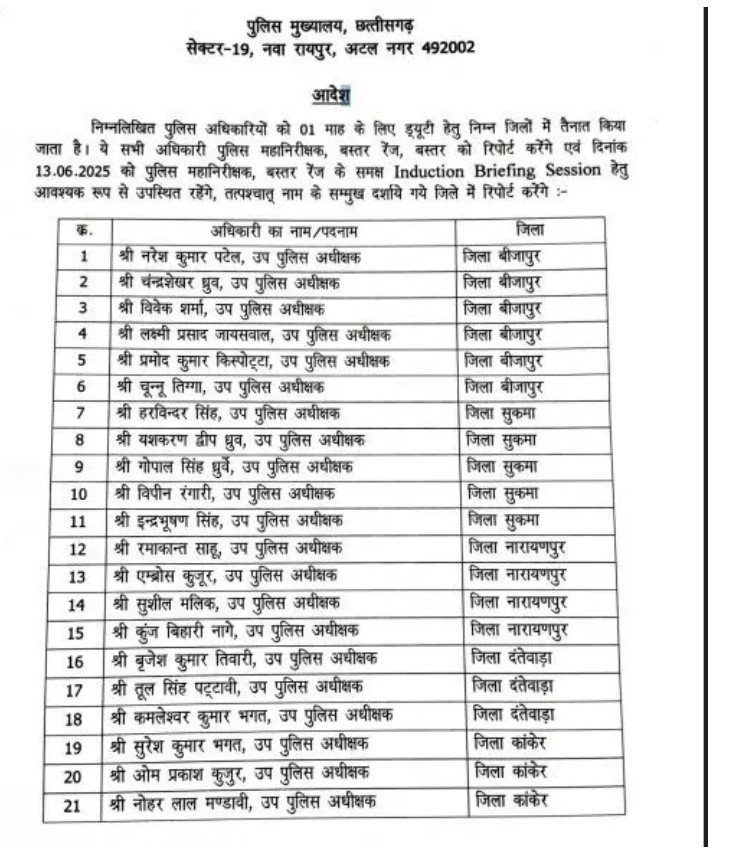 CG DSP Posting: रायपुर। छत्तीसगढ़ के डीजीपी ने पदोन्नत 21 डीएसपी को महीने भर के लिए ड्यूटी आदेश कर दिया है। जाहिर है, यह प्रोबेशन टाईप पोस्टिंग होगी। एक महीने के लिए यह पोस्टिंग की गई है। इसीलिए इसे डीजीपी द्वारा जारी किया गया है। इसमें स्पष्ट तौर पर लिखा है कि एक महीने की ड्यूटी लगाई जाती है।
