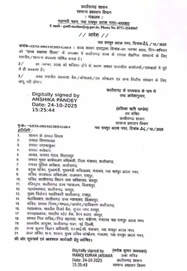 CG Foundation Day 2025 : रायपुर : स्कूली बच्चों, कॉलेज के विद्यार्थियों और सरकारी कर्मचारियों के लिए एक और अच्छी खबर है। दिवाली और छठ पर्व के बाद, छत्तीसगढ़ सरकार ने 1 नवंबर 2025 को सार्वजनिक अवकाश (Public Holiday) घोषित कर दिया है। यह छुट्टी छत्तीसगढ़ के 25वें स्थापना दिवस (राज्योत्सव) के उपलक्ष्य में घोषित की गई है।