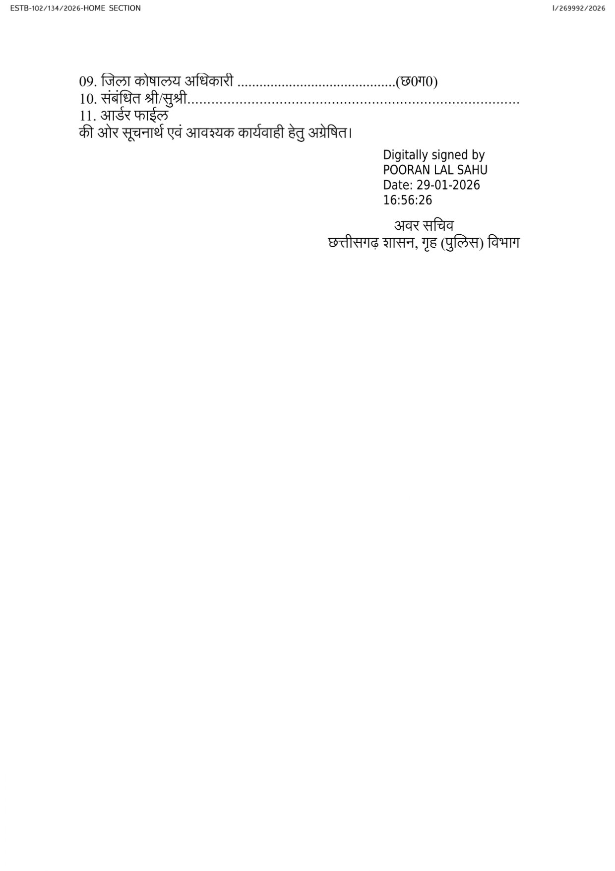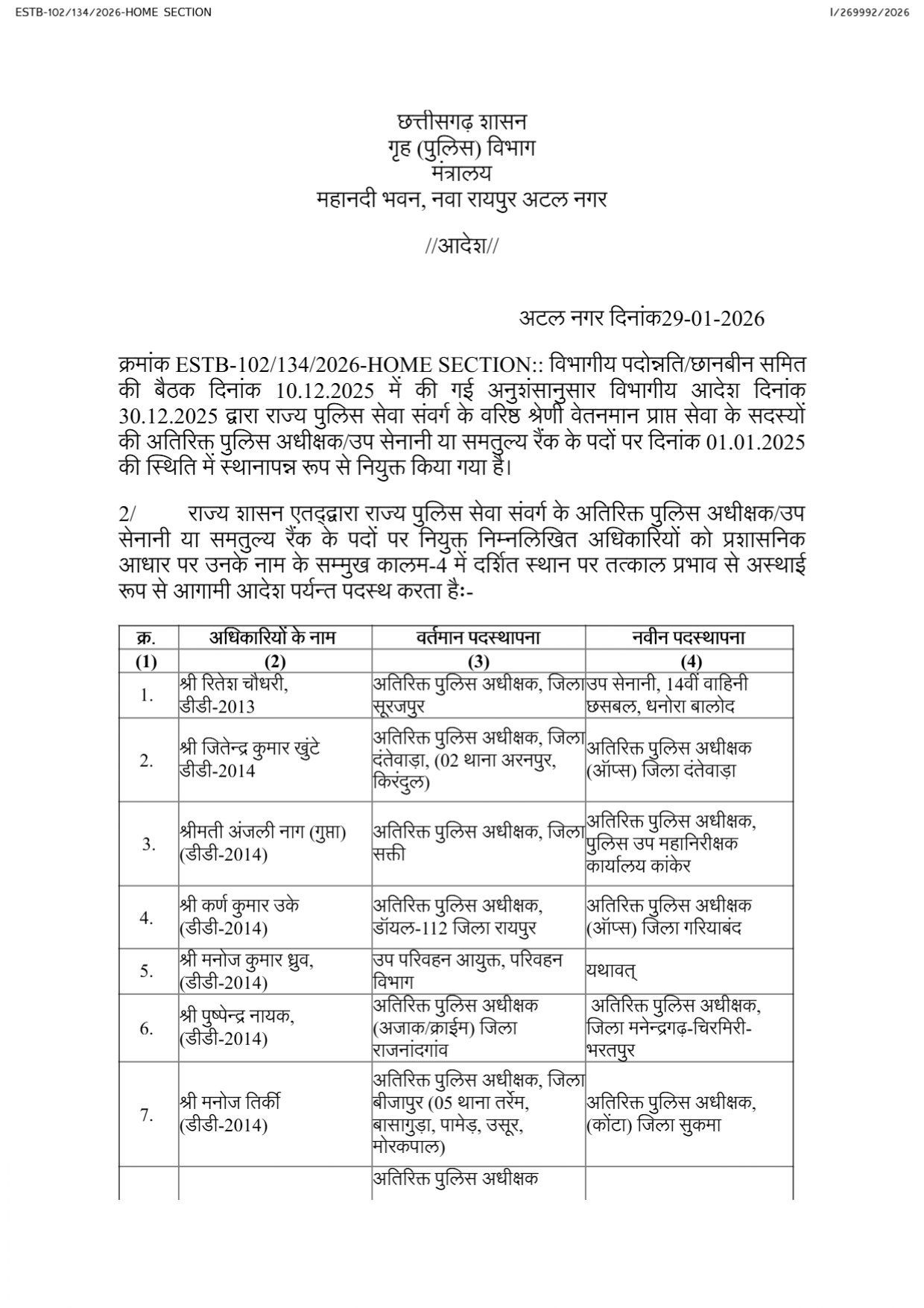 CG Home Department Order : रायपुर। छत्तीसगढ़ शासन के गृह विभाग ने राज्य पुलिस सेवा (SPS) संवर्ग के अधिकारियों के लिए पदोन्नति आदेश जारी किया है। विभागीय पदोन्नति-छानबीन समिति (DPC) की बैठक में की गई अनुशंसा के आधार पर, वरिष्ठ श्रेणी वेतनमान प्राप्त अधिकारियों को अतिरिक्त पुलिस अधीक्षक (ASP), उप सेनानी (Deputy Commandant) या इसके समतुल्य रैंक के पदों पर पदोन्नति दी गई है।