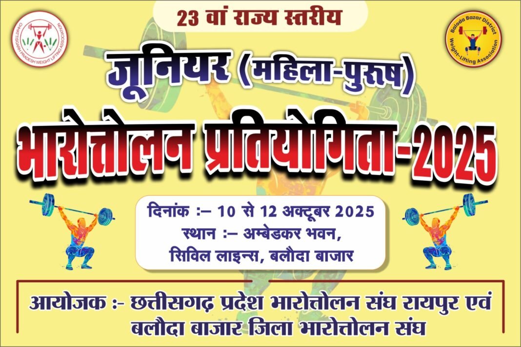 बलौदाबाजार। छत्तीसगढ़ प्रदेश भारोत्तोलन संघ एवं बलौदाबाजार जिला भारोत्तोलन संघ के संयुक्त तत्वावधान में 23वीं राज्य स्तरीय जूनियर (महिला-पुरुष) भारोत्तोलन प्रतियोगिता 2025 का आयोजन बलौदाबाजार में किया जा रहा है। प्रतियोगिता 10 अक्टूबर से 12 अक्टूबर तक अंबेडकर भवन (मांगलिक भवन), सिविल लाइन में आयोजित होगी। यह आयोजन भारतीय भारोत्तोलन संघ के नए वजन वर्ग समूहों के नियमों के अनुसार किया जा रहा है, जिसमें पुरुषों के 8 वर्ग और महिलाओं के 8 वर्ग निर्धारित किए गए हैं।