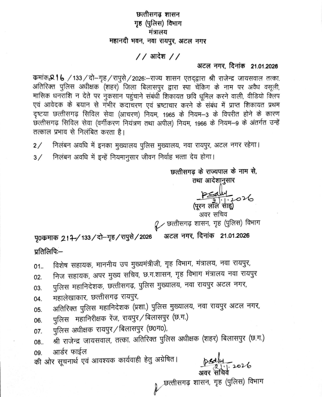 CG NEWS : रायपुर। छत्तीसगढ़ के बिलासपुर में स्पा सेंटर संचालक से वसूली के गंभीर आरोपों के बाद एडिशनल एसपी राजेंद्र जायसवाल को निलंबित कर दिया गया है। आज सुबह मीडिया से चर्चा के दौरान गृह मंत्री विजय शर्मा ने ऐसे मामलों में दोषी अधिकारियों को तत्काल निलंबित कर जांच कराने की बात कही थी, जिसके बाद अब राजेंद्र जायसवाल के खिलाफ निलंबन का आदेश जारी किया गया है।