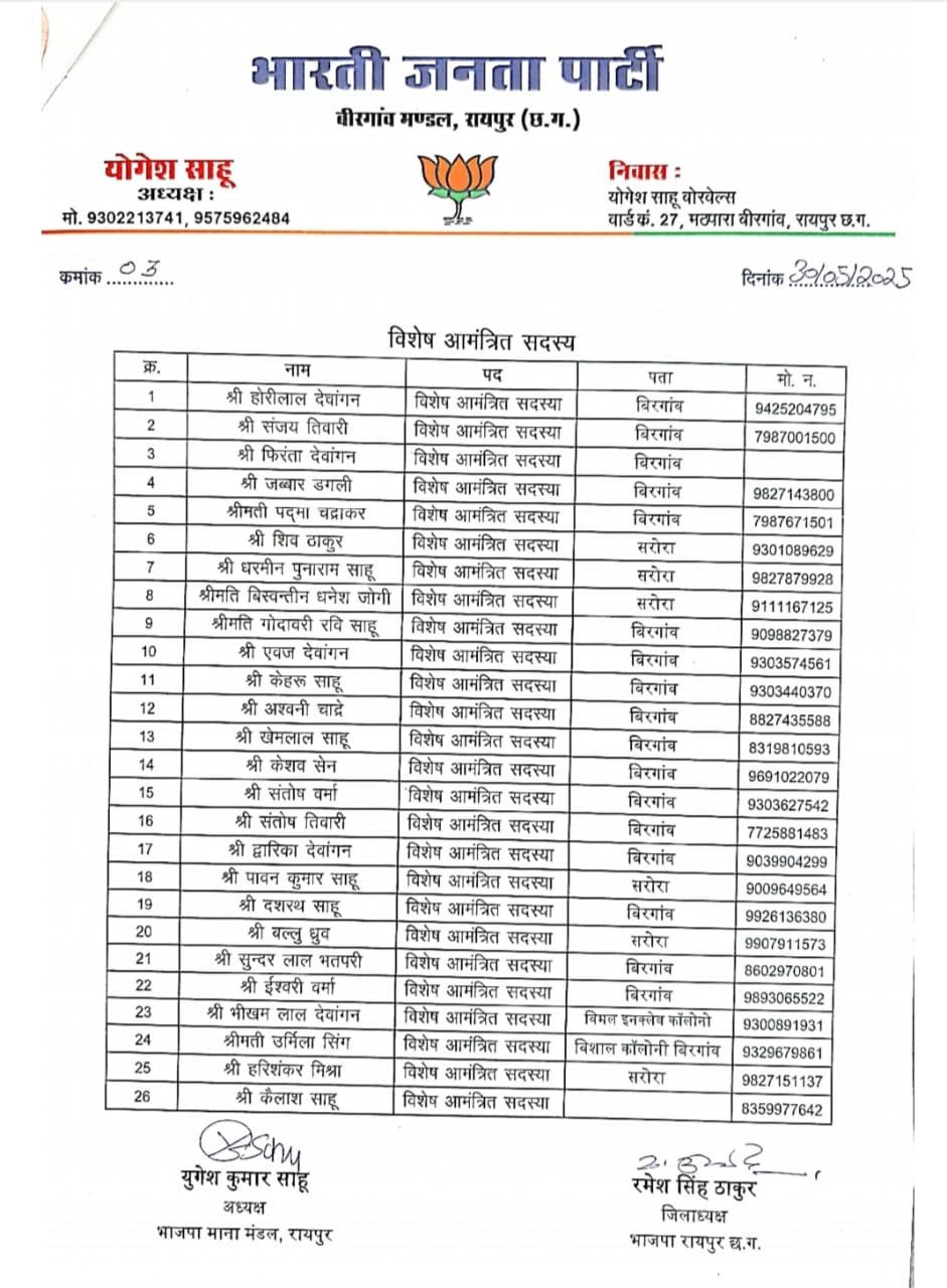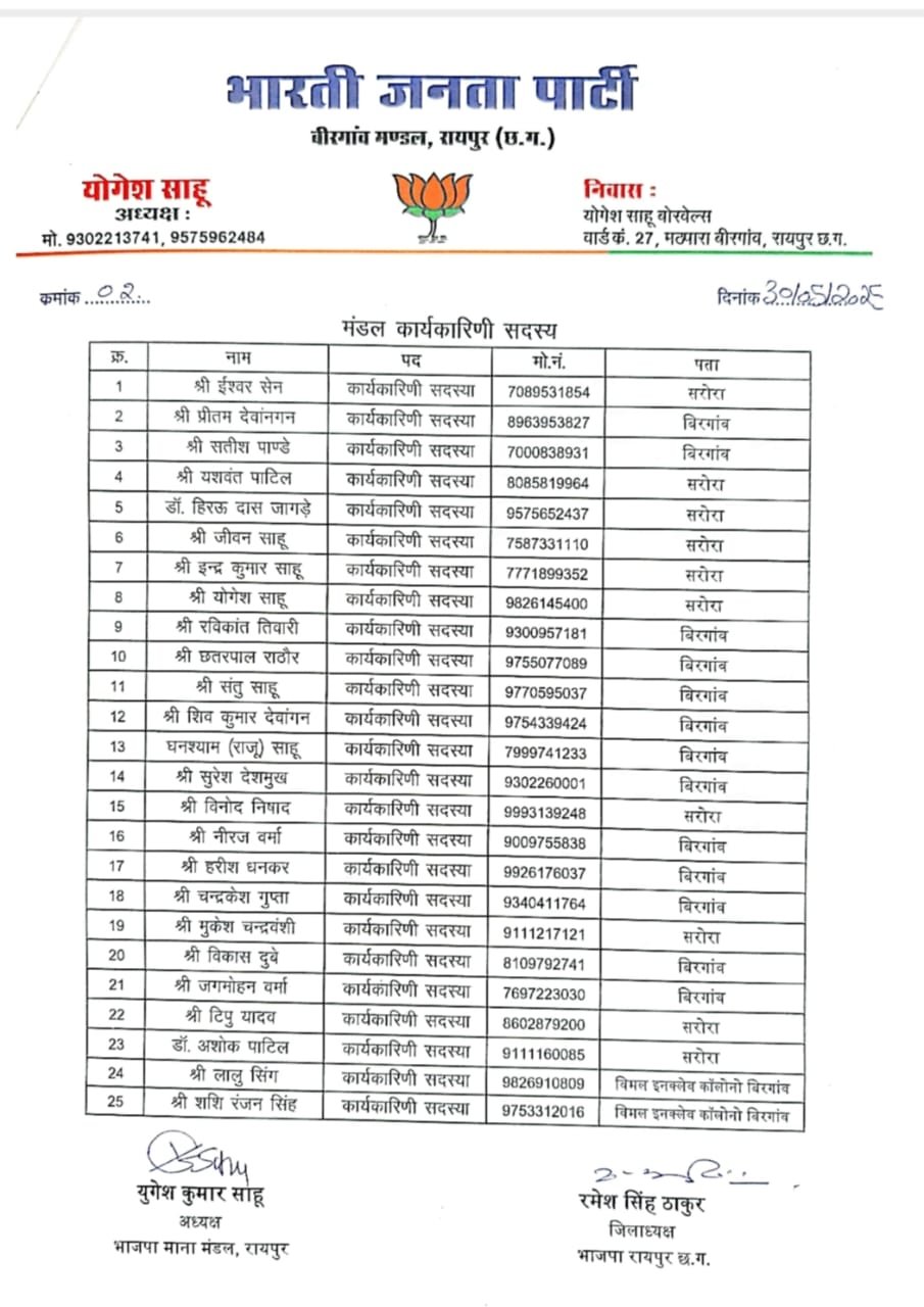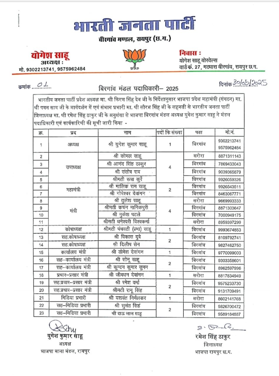 CG NEWS : रायपुर: भारतीय जनता पार्टी प्रदेश अध्यक्ष किरण सिंह देव के निर्देशानुसार भाजपा प्रदेश महामंत्री (संगठन) पवन साय के मार्गदर्शन में एवं संभाग प्रभारी सौरभ सिंह के सहमती से भारतीय जनता पार्टी जिलाध्यक्ष रमेश सिंह ठाकुर के अनुशंसा से भाजपा बीरगांव मंडल अध्यक्ष युगेश कुमार साहू ने मंडल पदाधिकारी एवं कार्यकारिणी की सूची जारी किया है.