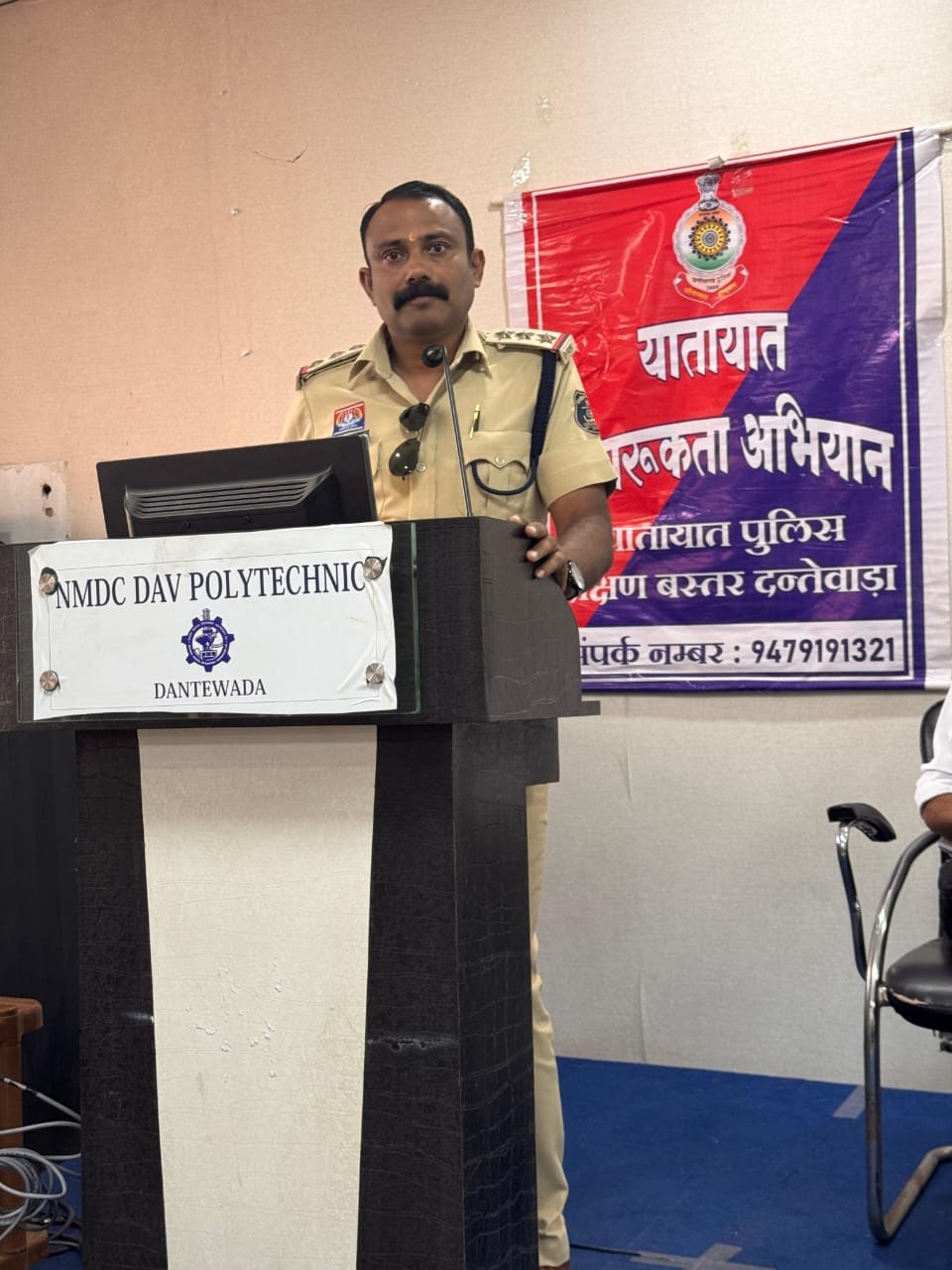 रिपोर्ट : फकरे आलम खान/दंतेवाड़ा : दंतेवाड़ा यातायात टीम द्वारा एनएमडीसी डीएवी पॉलिटेक्निक कॉलेज जावांगा में सड़क सुरक्षा जागरूकता कार्यशाला आयोजित की गई। यह कार्यक्रम पुलिस अधीक्षक दंतेवाड़ा, श्री गौरव राय (भा.पु.से.) के निर्देशन में आयोजित किया गया।