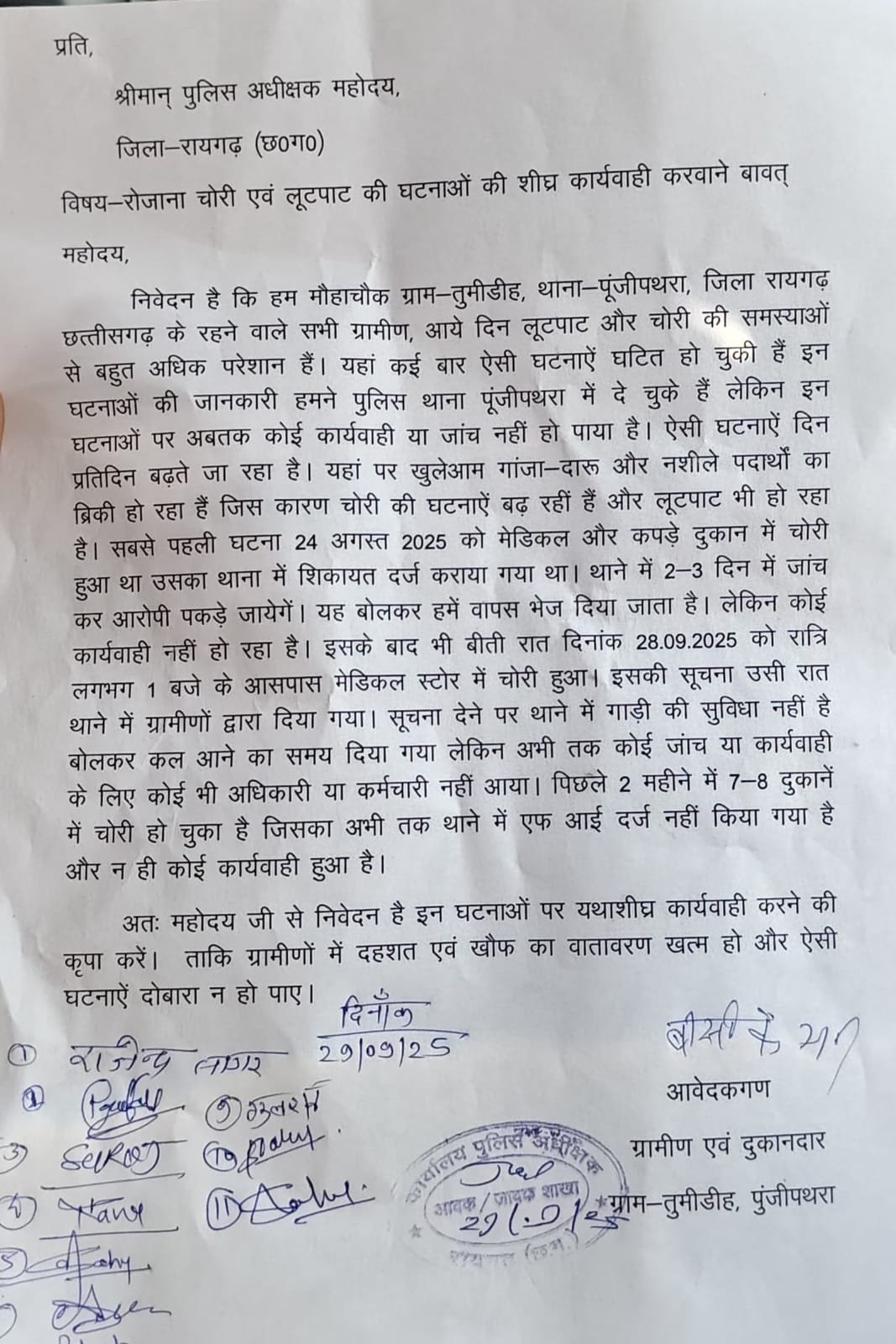 स्थिति इतनी गंभीर हो गई कि 29 सितंबर 2025 को ग्रामवासी और दुकानदार सामूहिक रूप से पुलिस अधीक्षक रायगढ़ को आवेदन सौंपने के लिए मजबूर हुए। आवेदन में ग्रामीणों ने लिखा कि थाना स्तर पर गंभीरता से कार्रवाई नहीं की जा रही, जिससे चोरों के हौसले बुलंद हैं और गांव में दहशत का माहौल बना हुआ है।