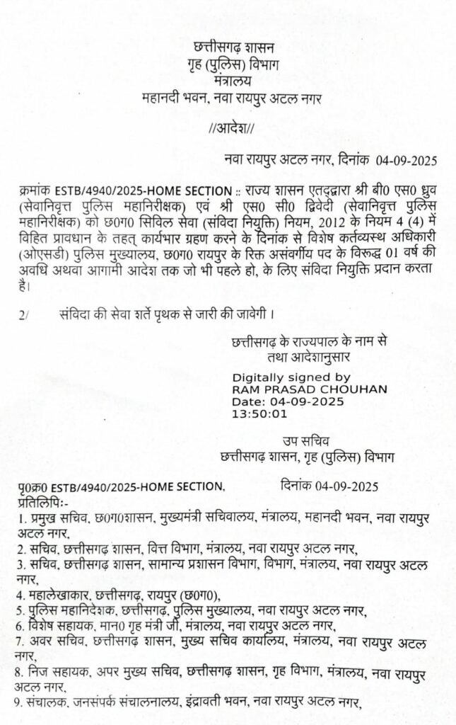 बीएस ध्रुव, जो पहले पुलिस महानिरीक्षक (IG) रहे हैं, और एससी द्विवेदी, जिन्होंने भी IG के रूप में लंबी सेवाएं दी हैं, को पुलिस मुख्यालय, नया रायपुर में विशेष कर्त्तव्यस्थ अधिकारी (OSD) के रूप में नियुक्त किया गया है। गृह विभाग ने इस संबंध में अधिसूचना जारी की है। दोनों अफसरों की नियुक्ति एक वर्ष के लिए की गई है, जबकि संविदा सेवा की विस्तृत शर्तें अलग से जारी की जाएंगी।