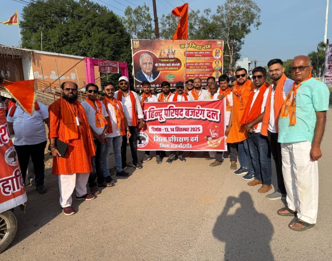 हेमंत वर्मा /डोंगरगढ़। माईं की नगरी डोंगरगढ़ के कच्छ गुर्जर गुजराती भवन में विश्व हिंदू परिषद एवं बजरंग दल का द्विवार्षिक जिला स्तरीय प्रशिक्षण वर्ग संपन्न हुआ। इस दो दिवसीय प्रशिक्षण वर्ग में राजनांदगांव जिले के खंड और प्रखंड के जिम्मेदार बजरंगियों ने भाग लिया और उन्हें राष्ट्र, धर्म, संस्कृति एवं संगठन की रीति-नीति से अवगत कराया गया।