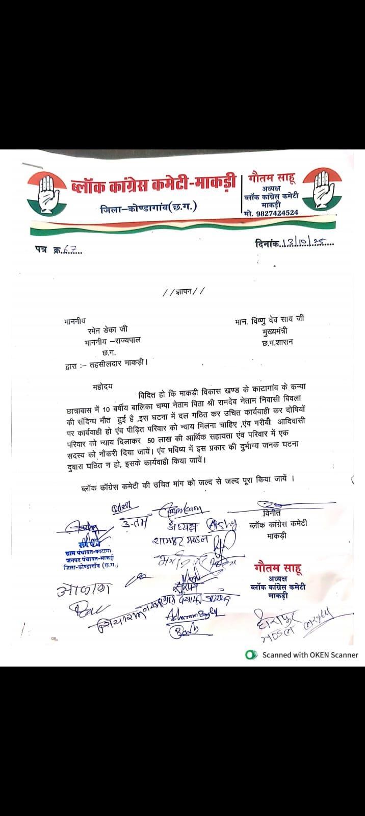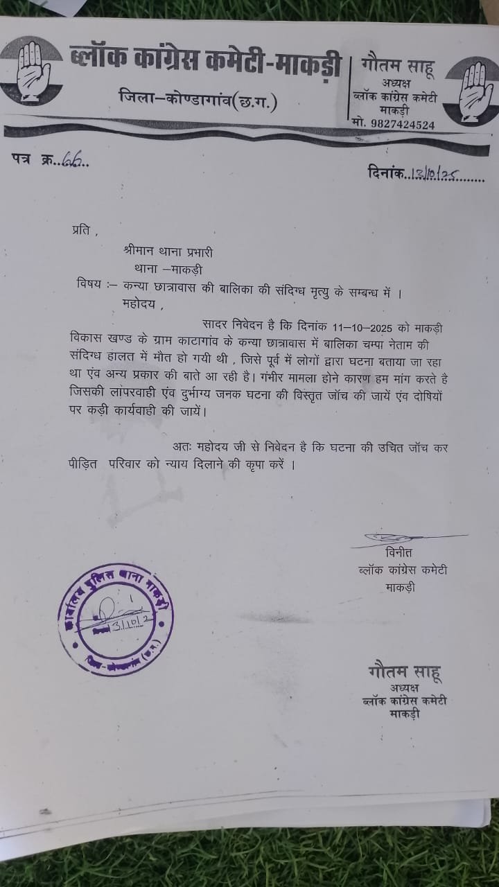 इस घटना के बाद ब्लॉक कांग्रेस कमेटी माकड़ी ने पुलिस थाना माकड़ी और तहसील कार्यालय में ज्ञापन सौंपा। ब्लॉक अध्यक्ष गौतम साहू ने मांग की: