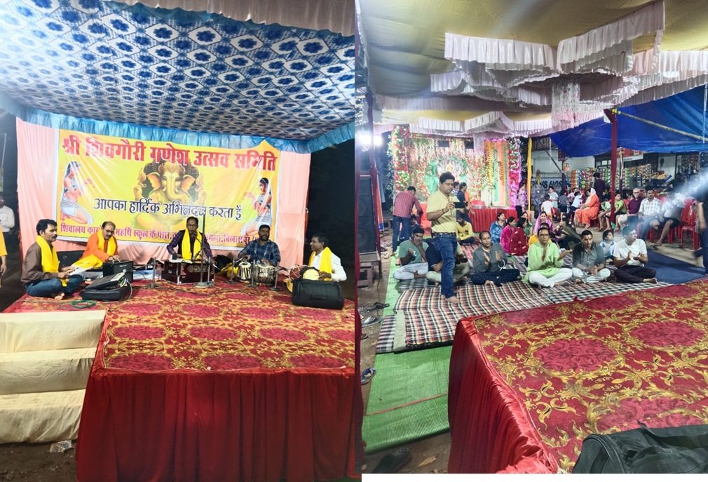CG News : घरघोड़ा /बिलासपुर : श्री शिव गौरी गणेशोत्सव समिति महर्षि स्कूल के निकटस्थ शिवालय काम्प्लेक्स परिसर में शनिवार की संध्या बिलासपुर शहर की प्रसिद्ध स्वरांजली भजन संध्या की प्रस्तुति की गई जिसमें सैकड़ों भक्तजनों ने प्रत्येक भक्ति गीतों पर तालियां बजाकर भावविभोर हो भक्तिमय वातावरण में सुमधुर गीतों का देर रात्रि तक श्रवण करते रहे भजन संध्या के प्रारंभ में स्वरांजली भजन संगीत के गायक व प्रमुख दुर्गा विश्वकर्मा,हारमोनियम विनोद ठाकरे,बेन्जो संजू लोनिया पेड,बसंत रजक तबला,विवेक साहू ढोलक के कला साधकों द्वारा मंच पर आयोजकों के द्वारा पीला अंगवस्त्र श्रीफल और टीका लगाकर आत्मीय स्वागत किया गया तत्पश्चात भगवान गणपति जी की संध्या आरती संगीतमय वातावरण में समूह में की गई प्रसाद का वितरण किया गया!