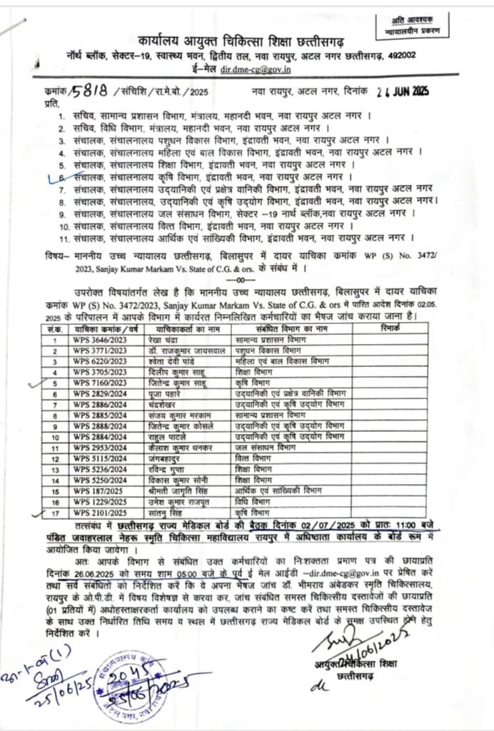 CG NEWS : जिन कर्मचारियों पर जांच होनी है, वे शिक्षा, महिला एवं बाल विकास, सामान्य प्रशासन, कृषि, विधि, पशुधन, जल संसाधन, आर्थिक एवं सांख्यिकी जैसे विभिन्न विभागों में कार्यरत हैं। आदेश में यह स्पष्ट किया गया है कि सभी संबंधित अधिकारी अपने विभाग के इन कर्मचारियों को निर्धारित तिथि व समय पर अनिवार्य रूप से उपस्थित कराएं। साथ ही जांच से पूर्व सभी को अपने चिकित्सीय दस्तावेज संबंधित विशेषज्ञ चिकित्सकों से प्रमाणित कराकर उपलब्ध कराने होंगे।