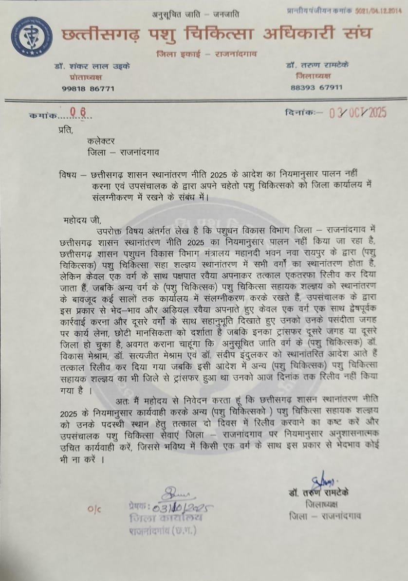 इस संबंध में पशु चिकित्सा अधिकारी संघ ने कलेक्टर के नाम से आवेदन देकर संलग्नीकरण को दो दिवस के भीतर समाप्त करने की मांग की है। आवेदन में यह भी उल्लेख किया गया है कि स्थानांतरण आदेश आते ही केवल अनुसूचित जाति/जनजाति के पशु चिकित्सकों को तुरंत रिलीव कर दिया जाता है, जबकि अन्य वर्ग के चिकित्सकों को कई महीनों-सालों तक संलग्नीकरण में रखा जाता है।