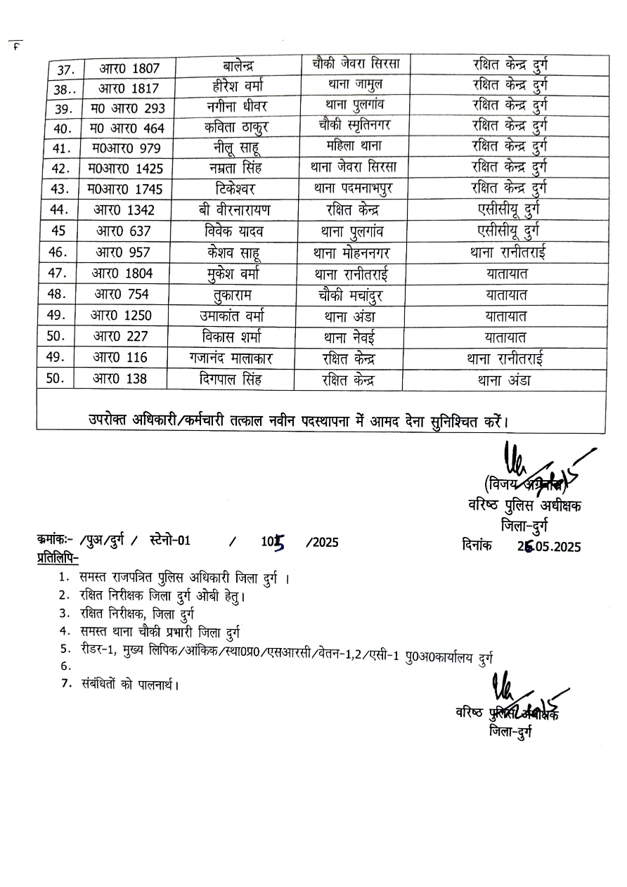 CG Police Transfer : दुर्ग। जिले में पुलिस विभाग में बड़े पैमाने पर फेरबदल हुआ है। वरिष्ठ पुलिस अधीक्षक (एसएसपी) विजय अग्रवाल ने सोमवार को एक आदेश जारी कर 50 पुलिस कर्मियों के तबादले किए हैं। इस तबादला सूची में 2 निरीक्षक, 3 उपनिरीक्षक, 5 प्रधान आरक्षक और 40 आरक्षक शामिल हैं। यह कार्रवाई विधि-व्यवस्था को और सुदृढ़ करने और प्रशासनिक दक्षता बढ़ाने के उद्देश्य से की गई है।