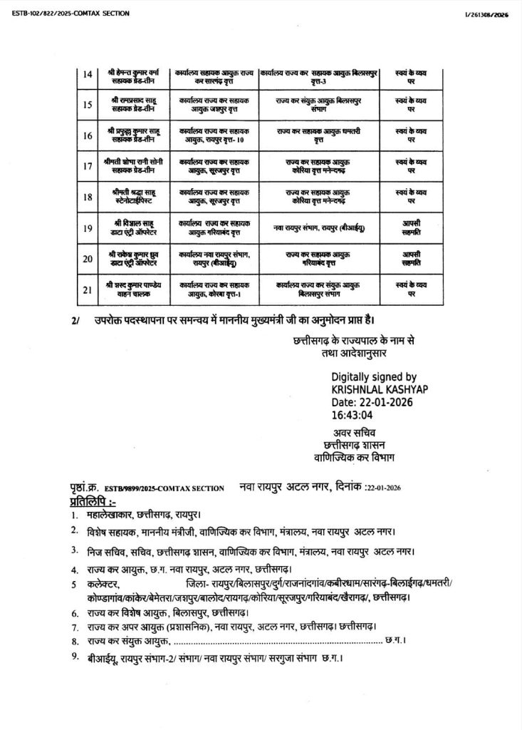 CG Transfer Breaking : वाणिज्यिक कर विभाग में बड़ा फेरबदल, 21 कर्मचारियों का तबादला