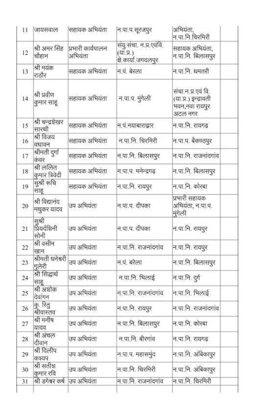 CG Transfer News : सूची में सहायक अधीक्षक, उप अभियंता, कार्यपालन अभियंता, प्रभारी कार्यपालन अभियंता, निरीक्षक, सहायक लेखा अधिकारी, वरिष्ठ स्वच्छता निरीक्षक, स्वच्छता निरीक्षक, सहायक वर्ग-1, सहायक ग्रेड-2 और सहायक वर्ग-2 जैसे पदों पर कार्यरत कर्मियों के नाम शामिल हैं। नगरीय निकायों की कार्यप्रणाली को अधिक प्रभावी और सुचारु बनाने के उद्देश्य से यह तबादला आदेश जारी किया गया है।