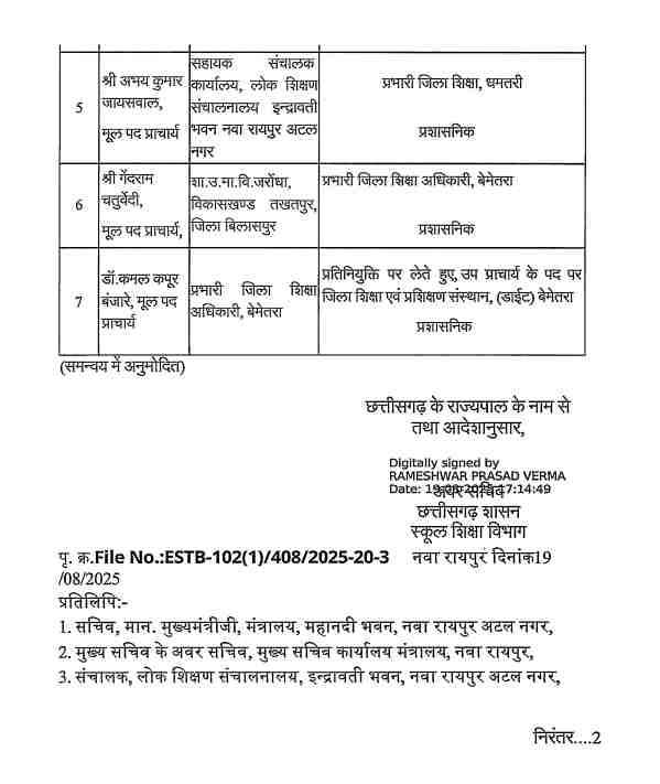 CG Transfer : रायपुर. शिक्षा विभाग ने कई अधिकारियों के तबादले किए हैं। इस फेरबदल में प्राचार्यों को जिला शिक्षा अधिकारी की अतिरिक्त जिम्मेदारी सौंपी गई है। स्कूल शिक्षा विभाग से जारी आदेश के अनुसार –