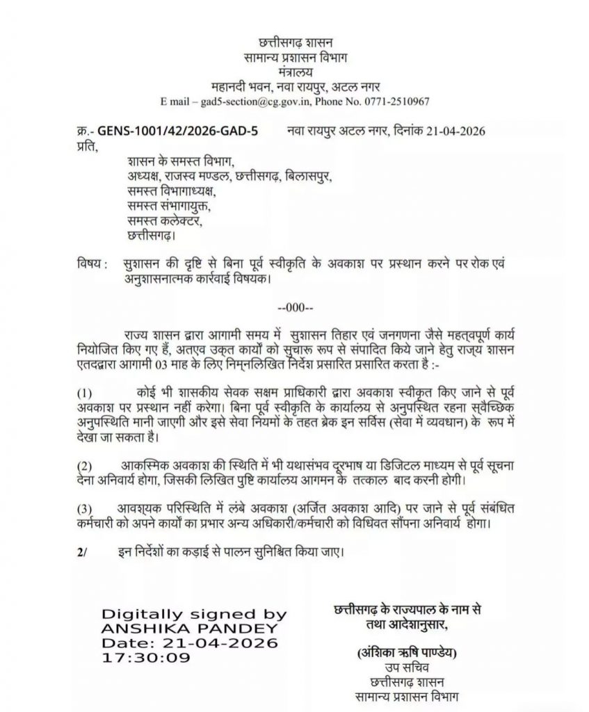 निशानेबाज न्यूज़ डेस्क : छत्तीसगढ़ के सरकारी कर्मचारियों के लिए एक अहम प्रशासनिक आदेश जारी किया गया है। राज्य सरकार ने अगले तीन महीनों तक कर्मचारियों की छुट्टियों पर रोक लगा दी है।