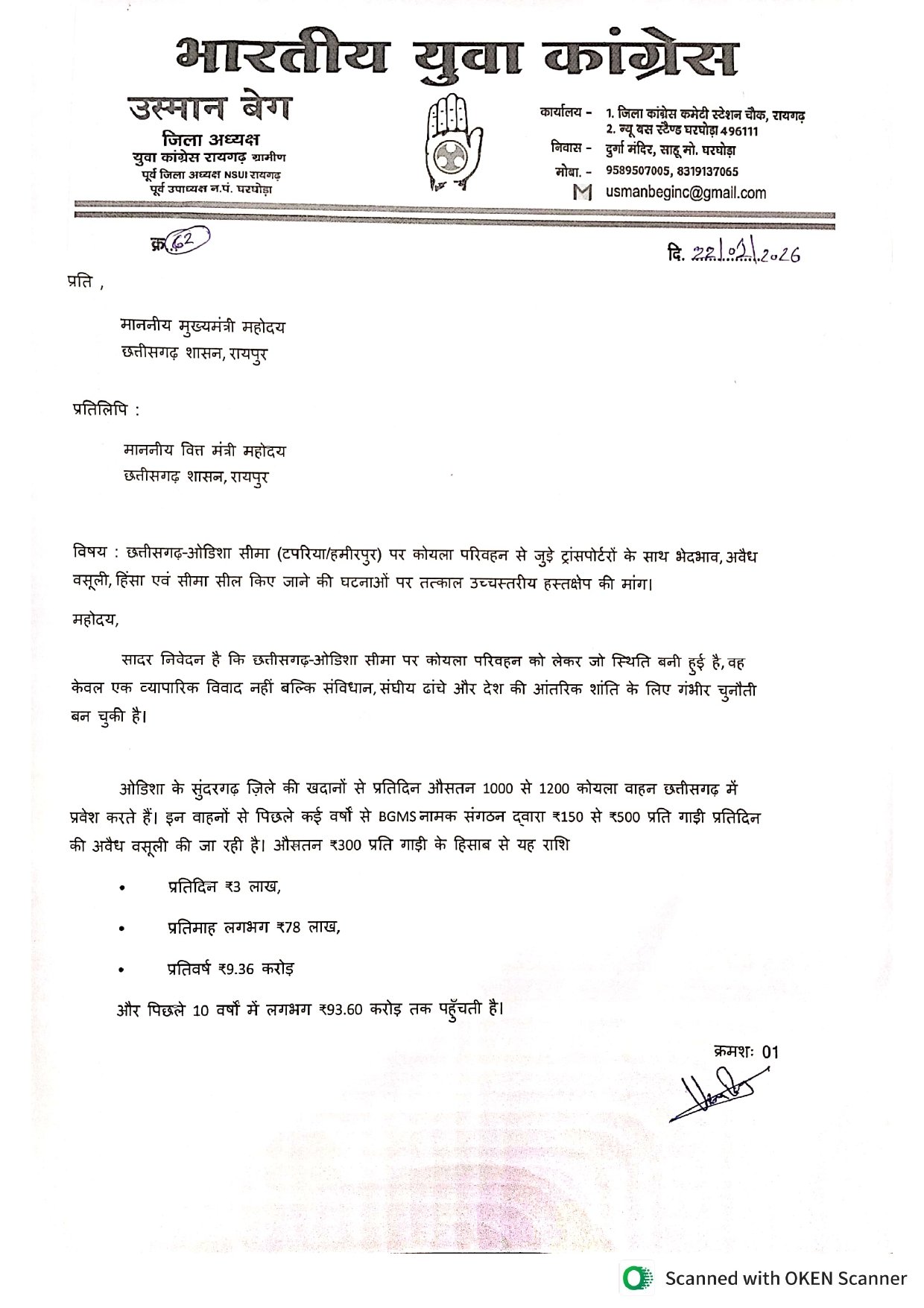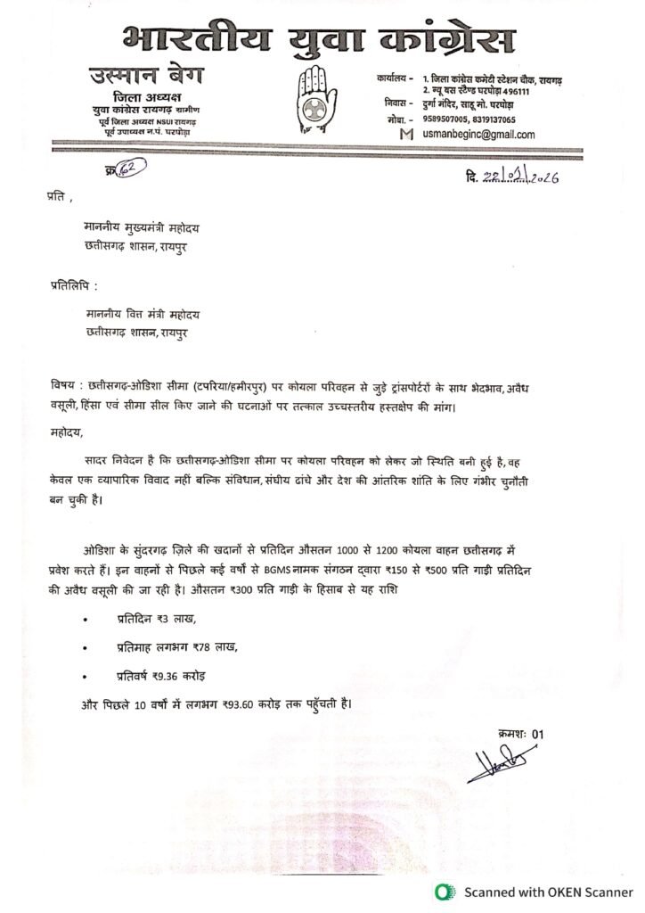 Chhattisgarh Odisha Coal Dispute : रायगढ़ : छत्तीसगढ़ और ओडिशा की सीमा पर कोयला परिवहन को लेकर स्थिति तनावपूर्ण बनी हुई है। युवा कांग्रेस के जिला अध्यक्ष उस्मान बेग ने इस संवेदनशील मामले में राज्य सरकार से तत्काल हस्तक्षेप की मांग की है। उन्होंने आरोप लगाया कि ओडिशा के सुंदरगढ़ जिले की खदानों से आने वाली गाड़ियों से BGMS नामक संगठन वर्षों से ₹150 से ₹500 प्रति गाड़ी की अवैध वसूली कर रहा है, जो अब तक करीब 93 करोड़ रुपये का बड़ा आकड़ा बन चुका है।
