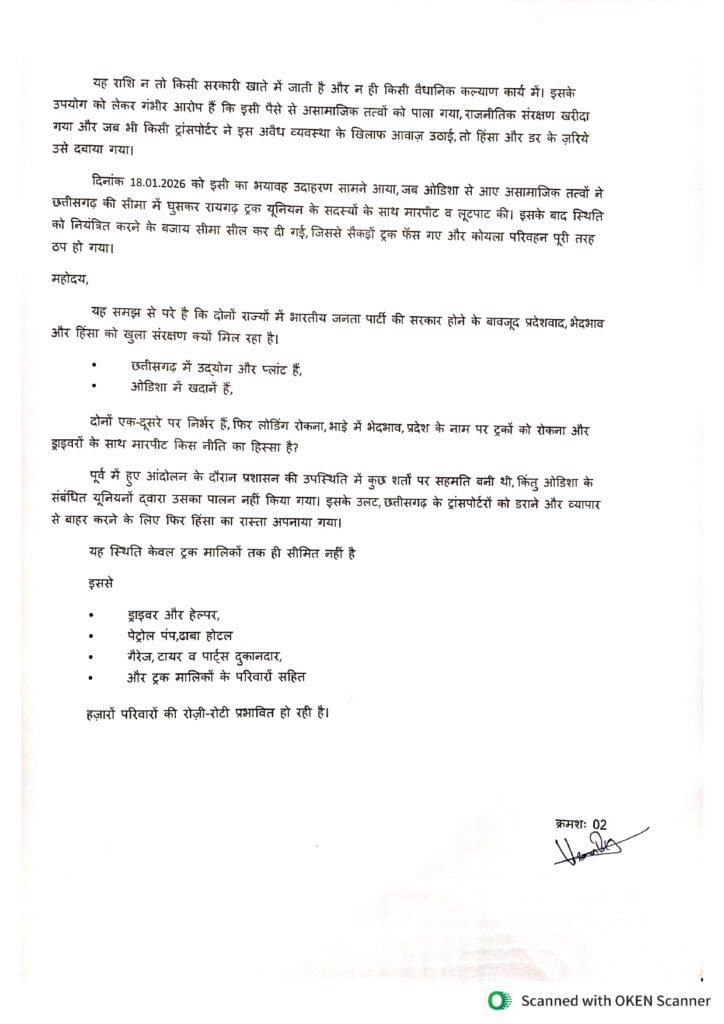 सीमा पर हिंसा और भेदभाव का आरोप: उस्मान बेग ने बताया कि 18 जनवरी 2026 को ओडिशा से आए असामाजिक तत्वों ने छत्तीसगढ़ की सीमा में घुसकर रायगढ़ ट्रक यूनियन के सदस्यों के साथ मारपीट और लूटपाट की। इसके बावजूद, दोषियों पर कार्रवाई करने के बजाय सीमा को सील कर दिया गया, जिससे सैकड़ों ट्रक फंसे हुए हैं। उन्होंने सवाल किया कि जब दोनों राज्यों में भाजपा की सरकार है, तो फिर छत्तीसगढ़ के ट्रांसपोर्टरों के साथ यह सौतेला व्यवहार किसके इशारे पर हो रहा है?
