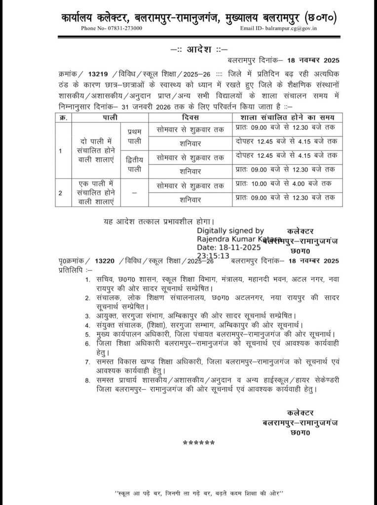 Chhattisgarh School Timing : बलरामपुर, छत्तीसगढ़। जिले में कड़ाके की ठंड को देखते हुए सभी शासकीय और निजी स्कूलों की समय-सारिणी में बड़ा बदलाव किया गया है। कलेक्टर ऑफिस से जारी आदेश के अनुसार, दो पाली में संचालित होने वाले स्कूलों की पहली पाली की कक्षाएं सुबह 9 बजे से दोपहर 12:30 बजे तक होंगी, जबकि शनिवार को यह दोपहर 12:45 बजे से शाम 4:15 बजे तक चलेंगी। दूसरी पाली की कक्षाएं दोपहर 12:45 बजे से 4:15 बजे तक रहेंगी, और शनिवार को यह सुबह 9 बजे से दोपहर 12:30 बजे तक संचालित होंगी।