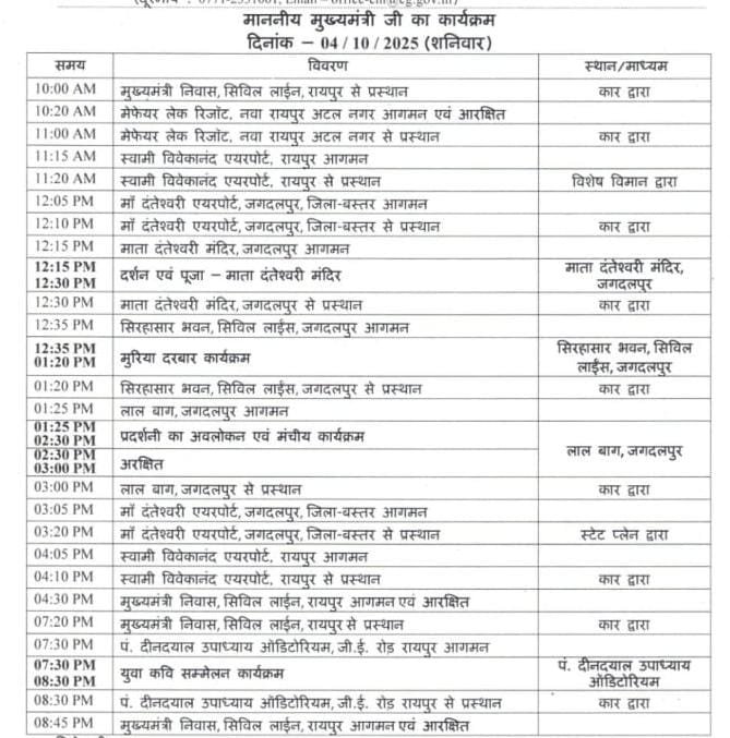रायपुर। मुख्यमंत्री श्री विष्णु देव साय का आज का दिन काफी व्यस्त रहने वाला है। उनके कार्यक्रम की शुरुआत मां दंतेश्वरी मंदिर के दर्शन से होगी, जहां वे देवी की पूजा-अर्चना करेंगे।