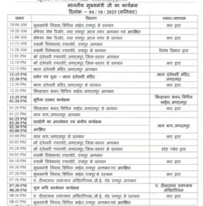 इसके बाद मुख्यमंत्री पंडित दीनदयाल उपाध्याय ऑडिटोरियम में आयोजित विभिन्न कार्यक्रमों में शामिल होंगे। अधिकारियों के अनुसार, इन कार्यक्रमों में मुख्यमंत्री की भागीदारी से प्रदेश में विकास और सामाजिक कार्यों के प्रति जनता का ध्यान केंद्रित होगा।