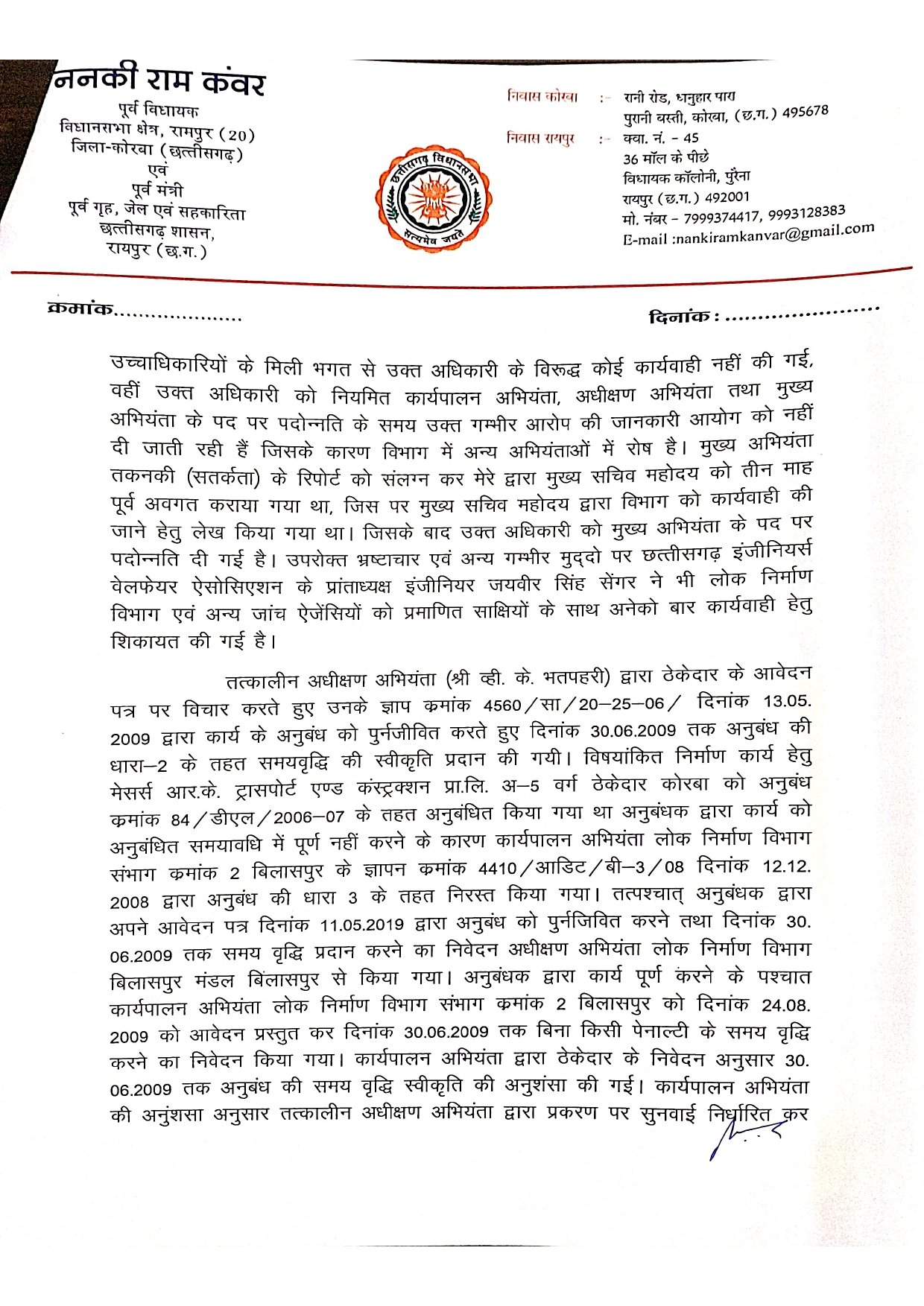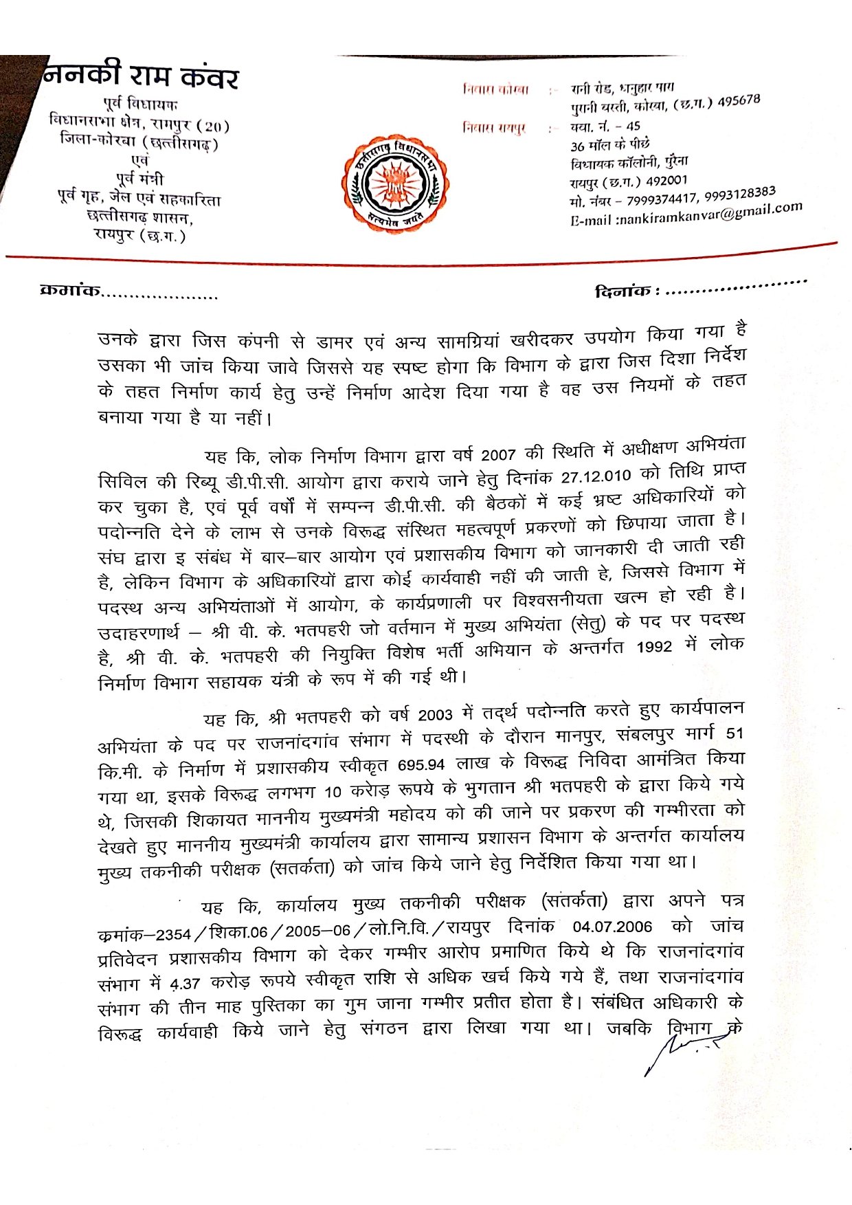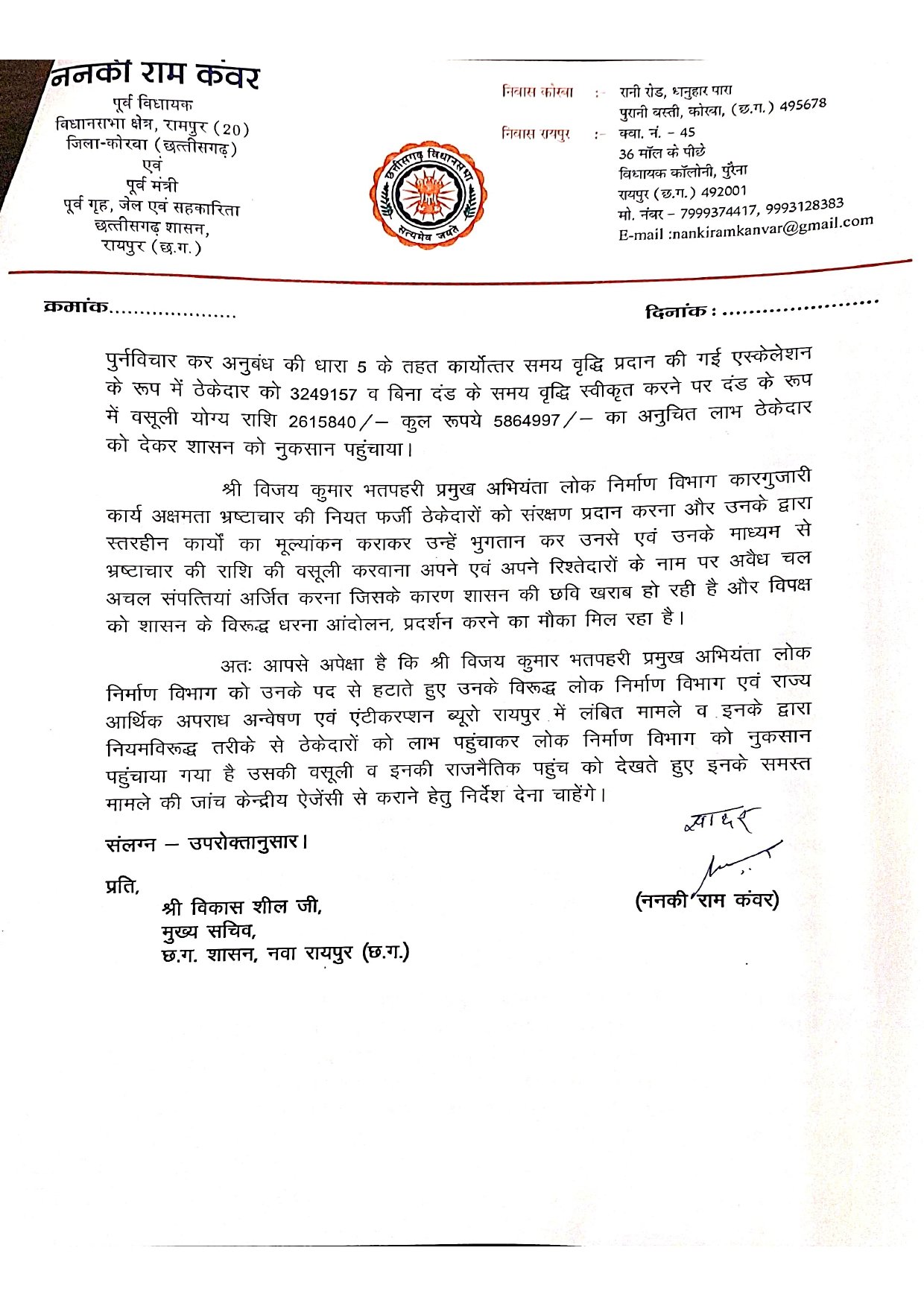 ननकी राम कंवर ने अपने पत्र में उल्लेख किया है कि विजय कुमार भतपहरी के खिलाफ वर्षों से भ्रष्टाचार के मामले लंबित हैं, लेकिन राजनीतिक पहुंच के कारण उन पर कोई कार्रवाई नहीं हो रही है: