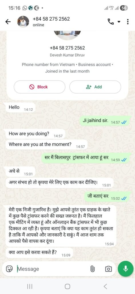 कलेक्टर श्री देवेश कुमार ध्रुव ने स्पष्ट किया है कि उनके नाम से चल रहा वह व्हाट्सएप नंबर या मोबाइल नंबर पूरी तरह फर्जी है। उन्होंने साफ कहा कि उनके द्वारा किसी भी व्यक्ति को इस तरह का कोई संदेश नहीं भेजा गया है। उन्होंने आम नागरिकों से अपील की है कि वे इस तरह के संदिग्ध संदेशों या कॉल के बहकावे में बिल्कुल न आएं और न ही कोई व्यक्तिगत जानकारी या आर्थिक सहायता साझा करें।