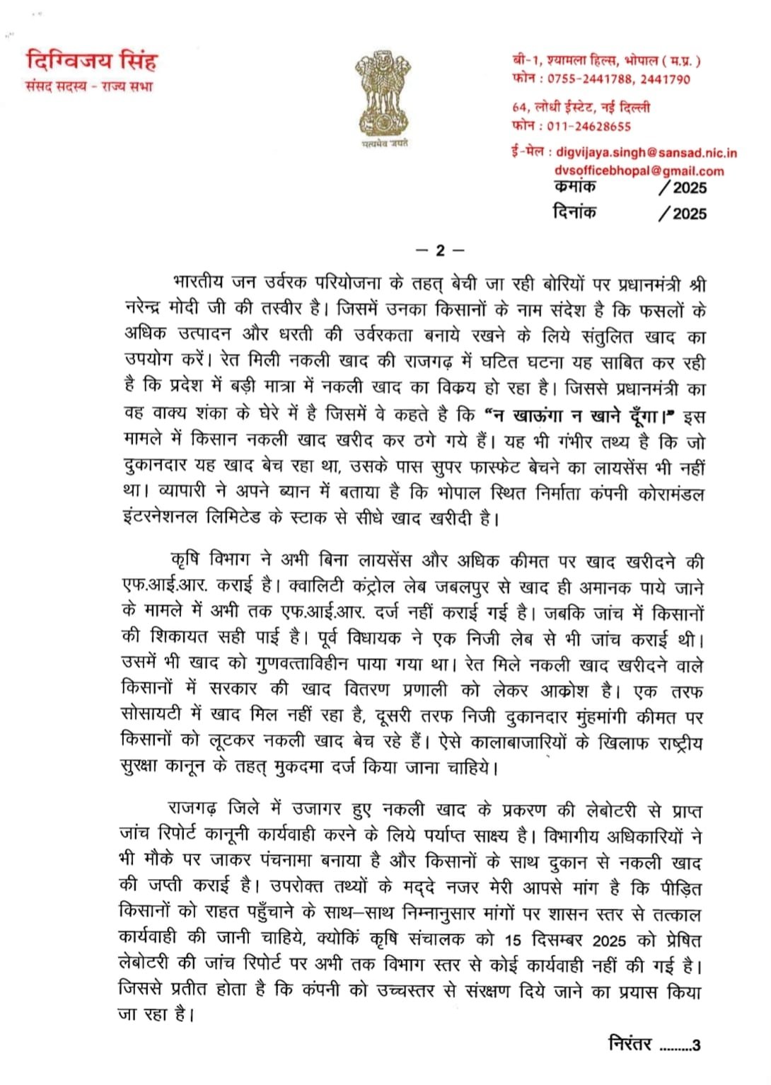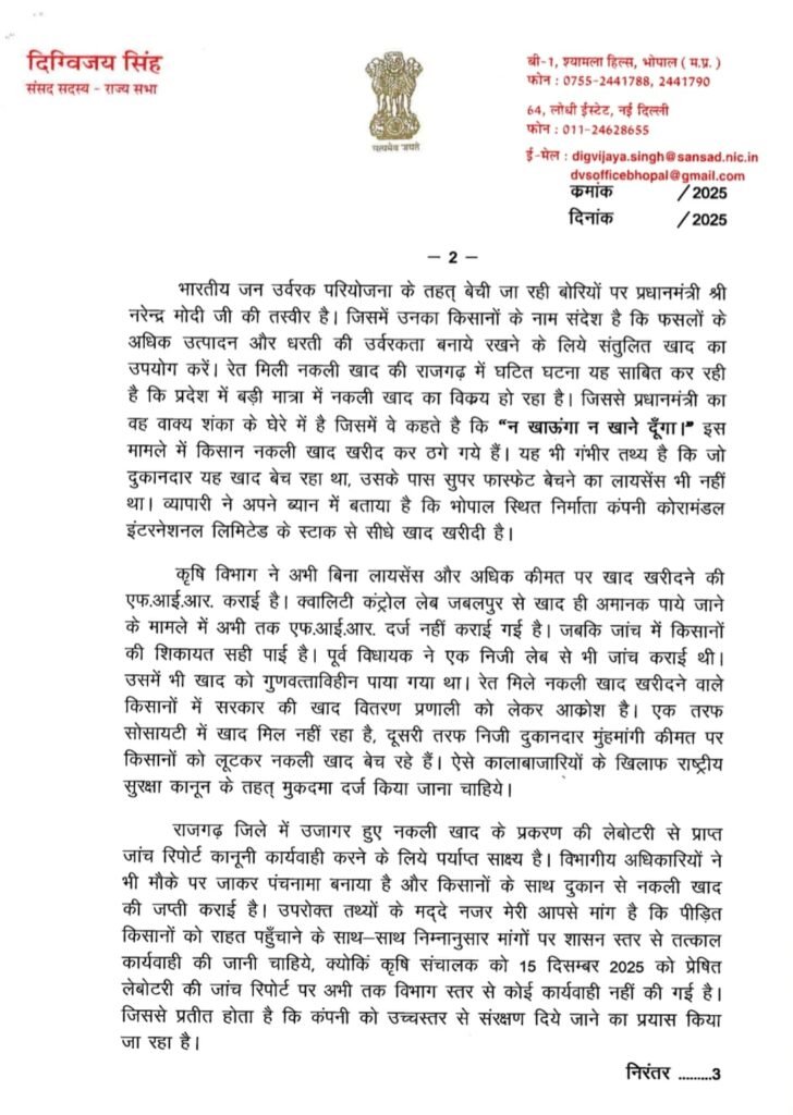 Digvijaya Singh Fake Fertilizer : भोपाल: राजगढ़ जिले में किसानों को सिंगल सुपर फास्फेट के नाम पर रेत मिली नकली खाद बेचे जाने का मामला अब राजनीतिक रूप से गरमा गया है। पूर्व मुख्यमंत्री दिग्विजय सिंह ने इस मुद्दे पर मुख्यमंत्री डॉ. मोहन यादव को एक विस्तृत पत्र लिखकर प्रदेशव्यापी ‘नकली खाद नेटवर्क’ का पर्दाफाश करने और दोषियों पर कठोरतम कार्रवाई की मांग की है।