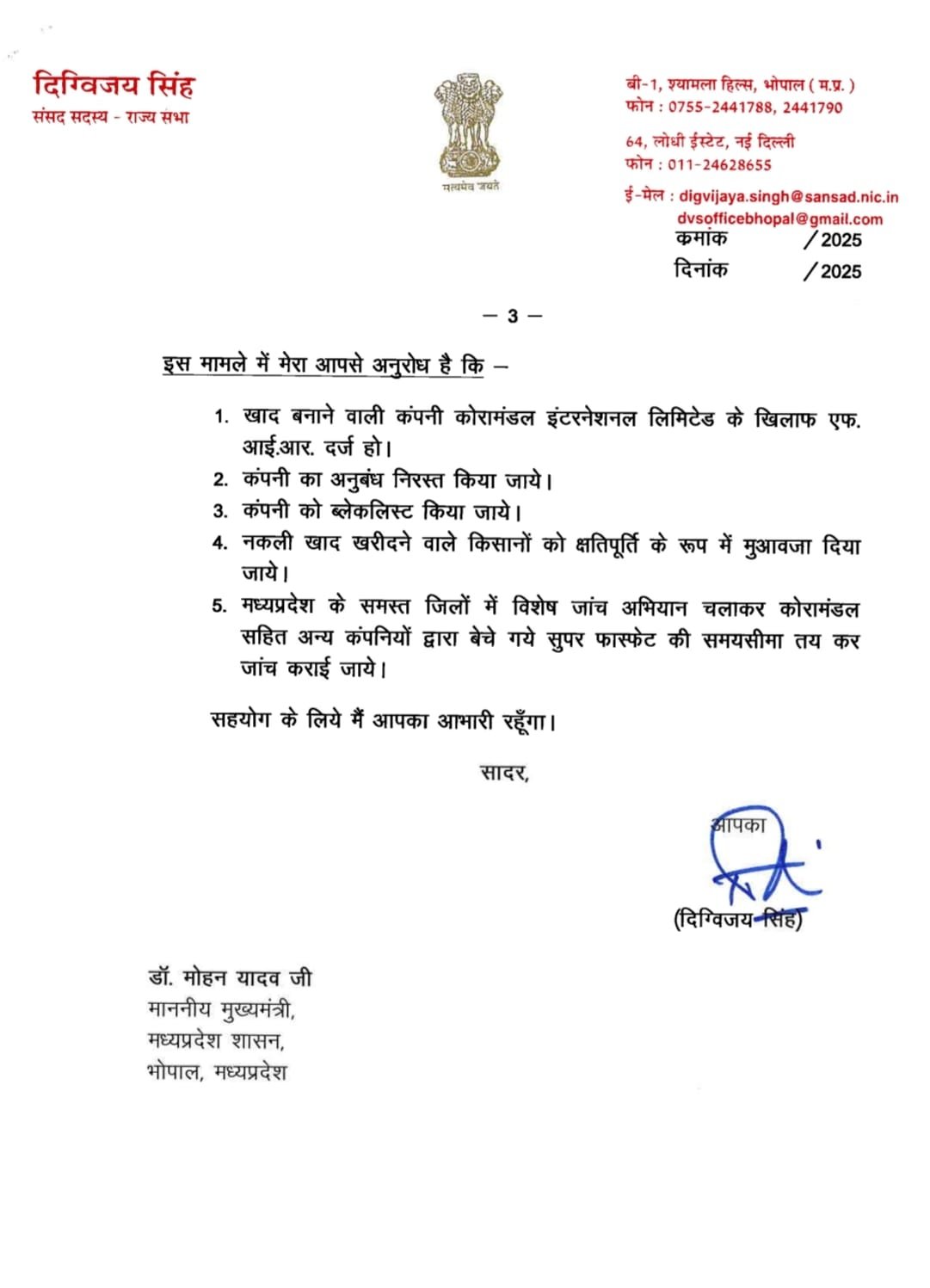 प्रदेशव्यापी जांच: मध्य प्रदेश के सभी जिलों में कोरामंडल सहित अन्य कंपनियों के खाद स्टॉक की समयबद्ध विशेष जांच कराई जाए।