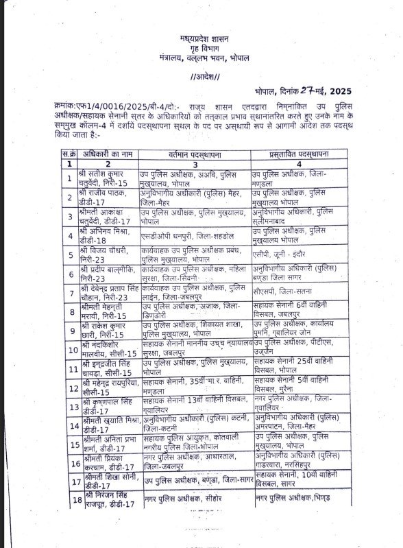 DSP TRANSFER : यह फेरबदल मप्र सरकार के पुलिस प्रशासन में पुनर्गठन की बड़ी कवायद के रूप में देखा जा रहा है। सरकार का उद्देश्य कानून व्यवस्था को और अधिक प्रभावी बनाना और क्षेत्रीय संतुलन बनाए रखना बताया जा रहा है। फिलहाल तबादला सूची में शामिल अधिकारियों के नाम और नई पदस्थापनाएं गृह विभाग की आधिकारिक अधिसूचना में देखी जा सकती हैं