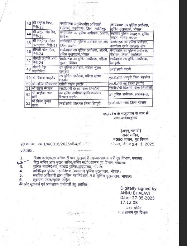 DSP TRANSFER : भोपाल। प्रदेश में एक बार फिर पुलिस महकमे में बड़ा प्रशासनिक बदलाव किया गया है। गृह विभाग की ओर से डीएसपी (उप पुलिस अधीक्षक)/सहायक सेनानी स्तर के 53 अधिकारियों के तबादले किए गए हैं। इस संबंध में आदेश गृह विभाग के अवर सचिव द्वारा जारी किया गया है।