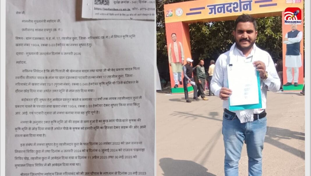 गरियाबंद: तहसील छुरा, एसडीएम और कलेक्टर कार्यालय में वर्षों से पैतृक कृषि भूमि के नक्शे सुधार में हो रही देरी से एक किसान परेशान होकर मुख्यमंत्री जनदर्शन में आवेदन लगाने को मजबूर हो गया है। ग्राम रजनकटा और पांडुका के बीच स्थित अपनी पैतृक भूमि का नक्शा सुधारवाने के लिए किसान पिछले तीन साल से राजस्व कार्यालयों के चक्कर काट रहे हैं, लेकिन मामूली बंदोबस्ती त्रुटि के कारण अभी तक न्याय नहीं मिल पाया।