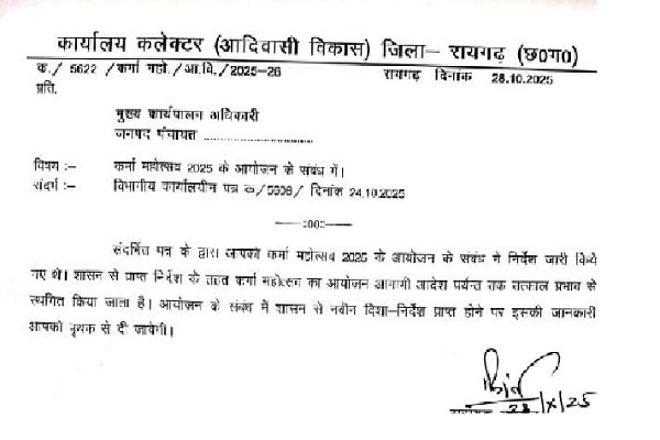 Gharghoda News : गौरीशंकर /घरघोड़ा : रायगढ़ जिले से एक महत्वपूर्ण सरकारी आदेश सामने आया है, जिसने आदिवासी समाज में गहरी चर्चा पैदा कर दी है। जिला कार्यालय (आदिवासी विकास) रायगढ़ द्वारा दिनांक 28 अक्टूबर 2025 को जारी पत्र क्रमांक 5622/कर्मा महोत्सव/आ.वि./2025-26 के माध्यम से यह सूचना दी गई है कि कर्मा महोत्सव 2025 के आयोजन को आगामी आदेश तक तत्काल प्रभाव से स्थगित किया जाता है।