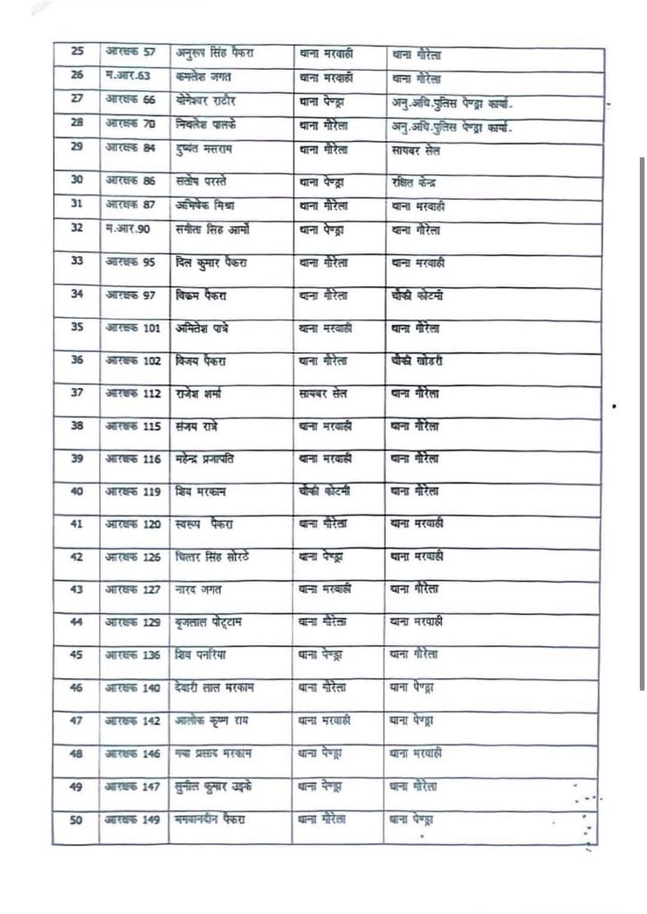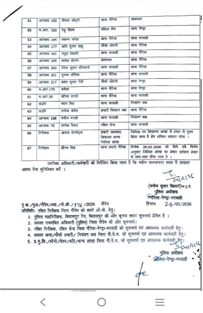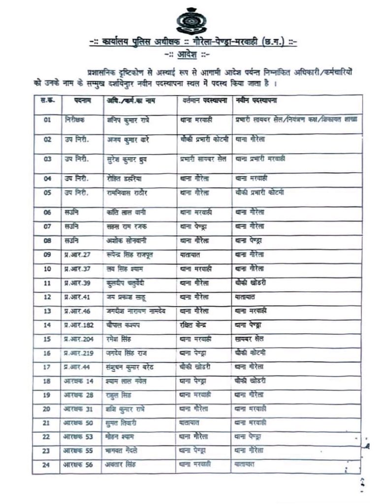 GPM Police Transfer News : गौरेला-पेण्ड्रा-मरवाही। जिले की पुलिस व्यवस्था को चुस्त-दुरुस्त बनाने और कार्यप्रणाली में पारदर्शिता लाने के उद्देश्य से पुलिस अधीक्षक (SP) मनोज कुमार खिलारी ने एक बड़ा प्रशासनिक फेरबदल किया है। एसपी ने उन सभी अधिकारी-कर्मचारियों का तबादला आदेश जारी कर दिया है, जिनकी एक ही स्थान पर तैनाती 3 वर्ष या उससे अधिक हो चुकी थी। इस बड़ी प्रशासनिक सर्जरी में कुल 67 पुलिसकर्मियों के नाम शामिल हैं।