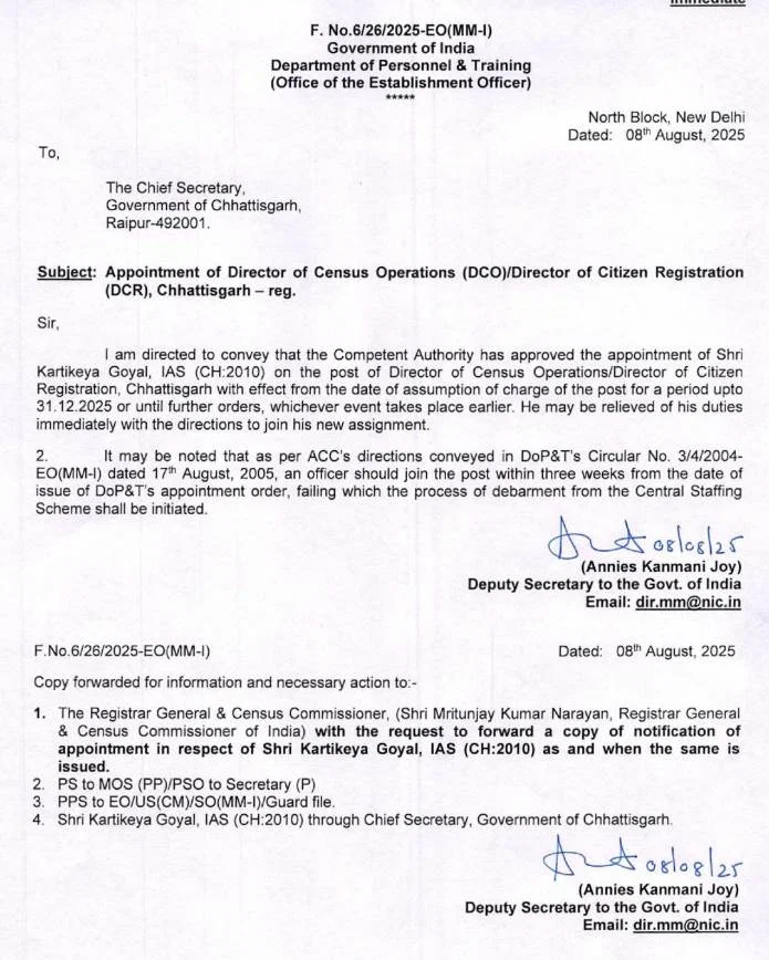IAS कार्तिकेय गोयल बने छत्तीसगढ़ के नए जनगणना संचालक, केंद्र सरकार ने नियुक्ति का आदेश जारी किया