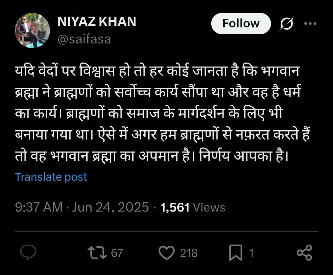 IAS Niaz Khan : नियाज खान ने अपने पोस्ट में लिखा है, “अगर वेदों पर विश्वास करते हैं, तो यह सर्वविदित है कि भगवान ब्रह्मा ने ब्राह्मणों को धर्म से जुड़े कार्यों के लिए चुना था। उन्हें समाज के मार्गदर्शन के लिए बनाया गया था। ऐसे में यदि कोई ब्राह्मणों से नफरत करता है, तो यह भगवान ब्रह्मा का ही अपमान है। फैसला आपका है। इससे पहले भी नियाज खान सनातन धर्म और इस्लाम से जुड़े मुद्दों पर अपने विचार साझा करते हुए विवादों में आ चुके हैं।