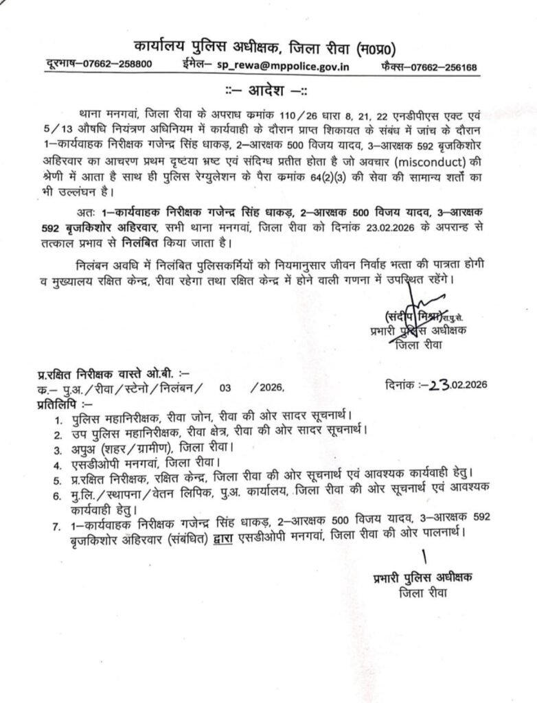 “मनगवां पुलिस द्वारा नशीली सिरप की कार्रवाई के दौरान जब्ती के सामान में हेराफेरी की शिकायत मिली थी। जांच में तथ्य सही पाए गए हैं, जिसके आधार पर थाना प्रभारी और दो आरक्षकों को निलंबित कर दिया गया है। अनुशासनहीनता और भ्रष्टाचार किसी भी कीमत पर बर्दाश्त नहीं किया जाएगा।”