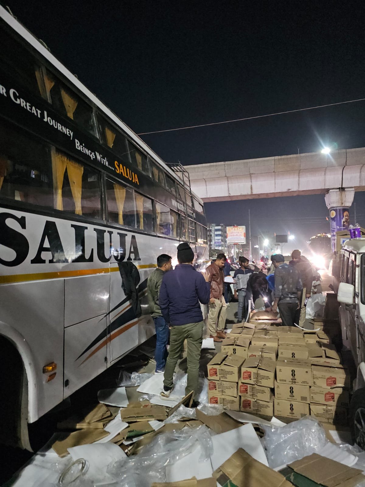 चेकिंग के दौरान, सलूजा स्लीपर बस की डिक्की से पुलिस को 90 पेटी अंग्रेजी शराब मिली। तस्कर कार्टूनों में छुपाकर ये शराब इंदौर से अहमदाबाद (गुजरात) ले जा रहे थे। जब्त की गई शराब की कुल मात्रा लगभग 800 लीटर है, जिसमें 4320 अंग्रेजी शराब की बोतलें शामिल हैं। जब्त शराब की कीमत लगभग साढ़े 7 लाख रुपये आंकी गई है।