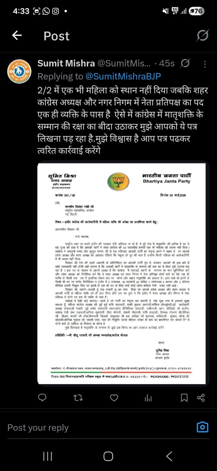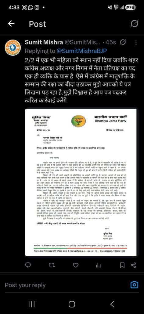 प्रियंका गांधी को संबोधित करते हुए सुमित मिश्रा ने उनके चर्चित नारे ‘लड़की हूं, लड़ सकती हूं’ की याद दिलाई। उन्होंने पत्र में लिखा कि यह बड़े ही दुख का विषय है कि एक ओर आप महिला सशक्तिकरण की बात करती हैं, वहीं दूसरी ओर आपकी ही पार्टी के प्रदेश नेतृत्व ने इंदौर में महिला शक्ति को हाशिए पर धकेल दिया है। मिश्रा ने कटाक्ष करते हुए कहा कि इंदौर में शहर अध्यक्ष और नगर निगम में नेता प्रतिपक्ष जैसे दो महत्वपूर्ण पद एक ही व्यक्ति के पास केंद्रित हैं, जो पार्टी के भीतर आंतरिक लोकतंत्र और महिला प्रतिनिधित्व की कमी को दर्शाता है।