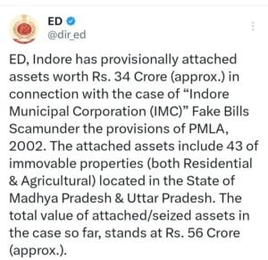 Indore: इंदौर नगर निगम में सामने आए बहुचर्चित फर्जी बिल घोटाले में प्रवर्तन निदेशालय (ED) ने एक और बड़ी कार्रवाई की है। ईडी ने मनी लॉन्ड्रिंग के मामले में करीब 34 करोड़ रुपये की संपत्तियों को अटैच किया है। ये कार्रवाई प्रिवेंशन ऑफ मनी लॉन्ड्रिंग एक्ट (PMLA) के तहत की गई है। ईडी द्वारा अटैच की गई संपत्तियों में मध्य प्रदेश और उत्तर प्रदेश में स्थित 43 रिहायशी और कृषि भूमि शामिल हैं। ये संपत्तियां नगर निगम के अधिकारियों और ठेकेदारों से जुड़ी हैं, जिन पर भ्रष्टाचार और सरकारी धन की हेराफेरी का आरोप है।