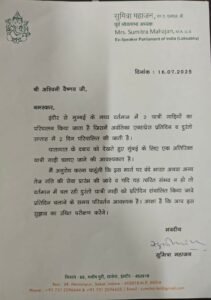 Indore News : सुमित्रा महाजन ने पत्र में लिखा है कि इंदौर और मुंबई के बीच तेज़, सुरक्षित और सुविधाजनक रेल सेवा की लंबे समय से ज़रूरत महसूस की जा रही है। इससे पहले भी उन्होंने करीब 15 महीने पहले रेल मंत्रालय को इसी विषय में पत्र भेजा था, लेकिन अब तक कोई ठोस कार्रवाई नहीं हुई है। महाजन ने वंदे भारत जैसी आधुनिक ट्रेन को इंदौर से मुंबई के बीच चलाने की मांग करते हुए यात्रियों की संख्या और मार्ग की व्यस्तता का हवाला भी दिया।